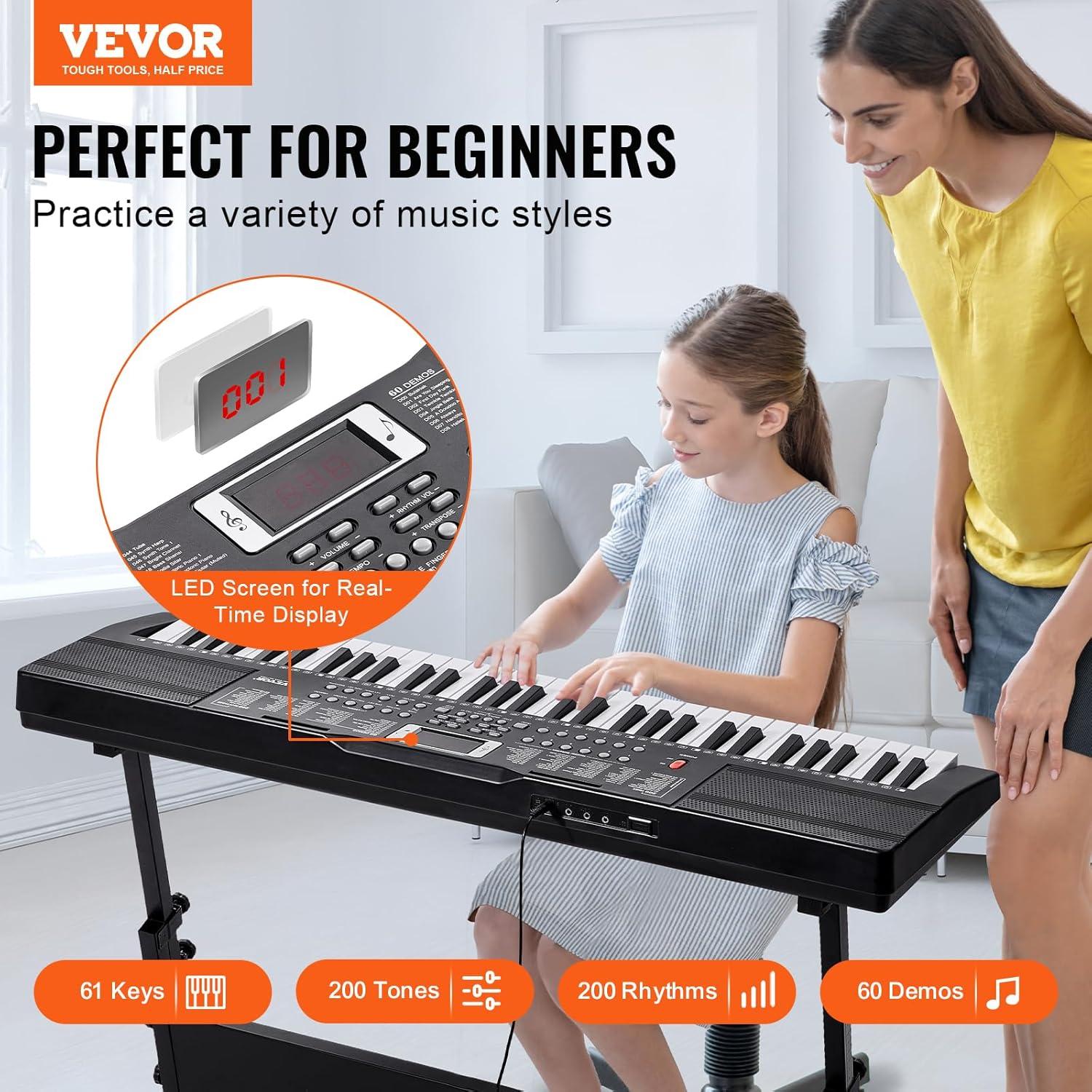 VEVOR 61 Key Digital Keyboard Piano, Lighted Keys, Electric Portable Piano with Adjustable Stand 600 Tones 500 Rhythms Built-In Speakers Sustain Pedal Headphones Microphone, USB MIDI for Beginners(Piano 61 Key with Stand)