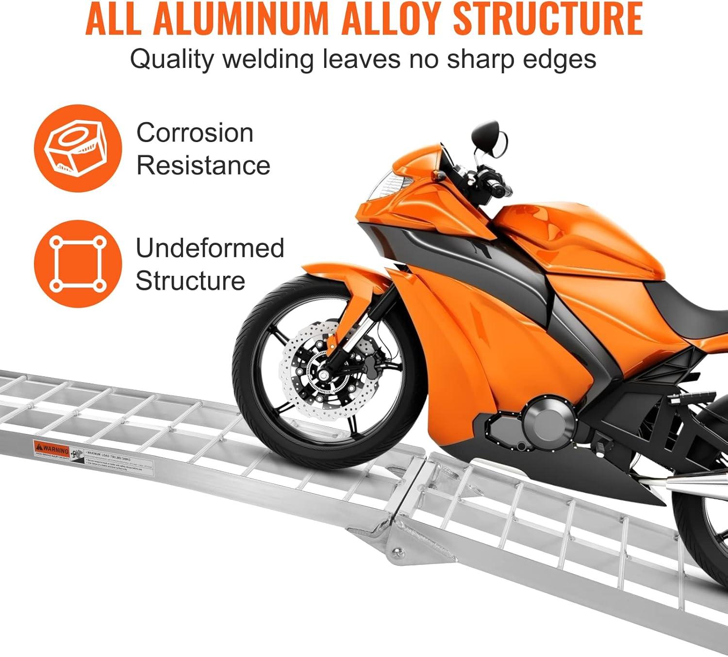 Lightweight but Durable: The VEVOR 2 pcs truck ramps are the perfect combination of quality and strength. Made from premium aluminum alloy and tested for security, it can support up to 750 LBS/per (1500 LBS/ a pair) while weighing only 30 LBS. A pair of ramps work for ATVs,/ UTVs, bikes, motorcycles, etc.