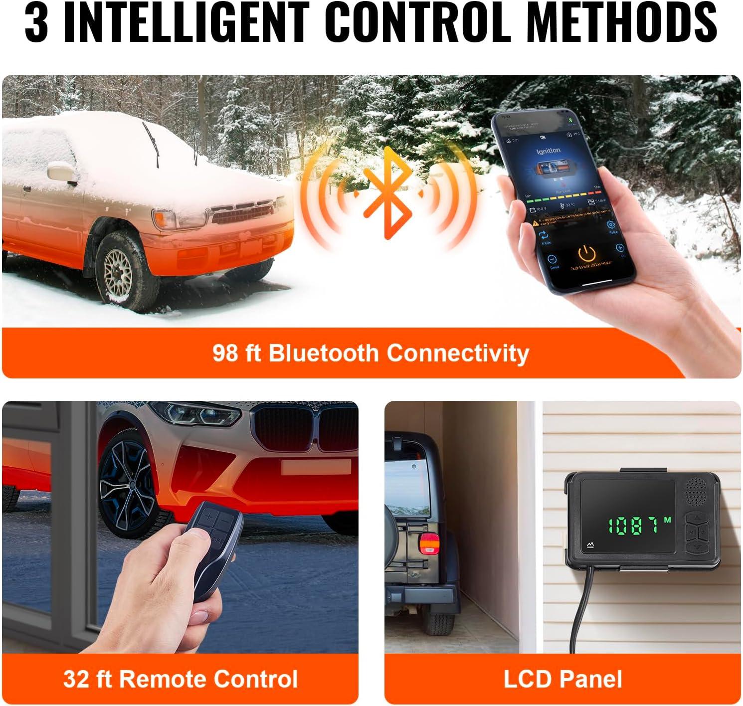 Dual Control Options: The portable diesel heater includes a 98ft remote control for preheating from outside the vehicle, keeping the interior warm and avoiding frost. The LCD screen allows for temperature adjustment between 46-97℉ to suit your needs