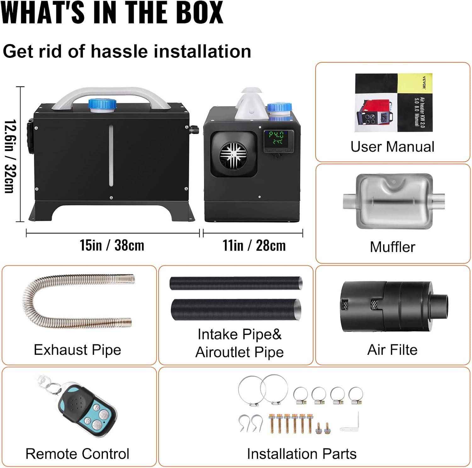 Easy Installation-free Solution: Enjoy efficient heating with our diesel heater all in one that requires no installation, making it perfect for outdoor adventures like camping. Heater Power: 8 KW; Rated Voltage: 12 V. Applicable Range: 215-269ft²/20-25m². Within just 10 minutes, our innovative sandblasting aluminum heat exchanger ensures rapid and efficient heat transfer, ensuring a comfortable temperature inside your vehicle or boat.
