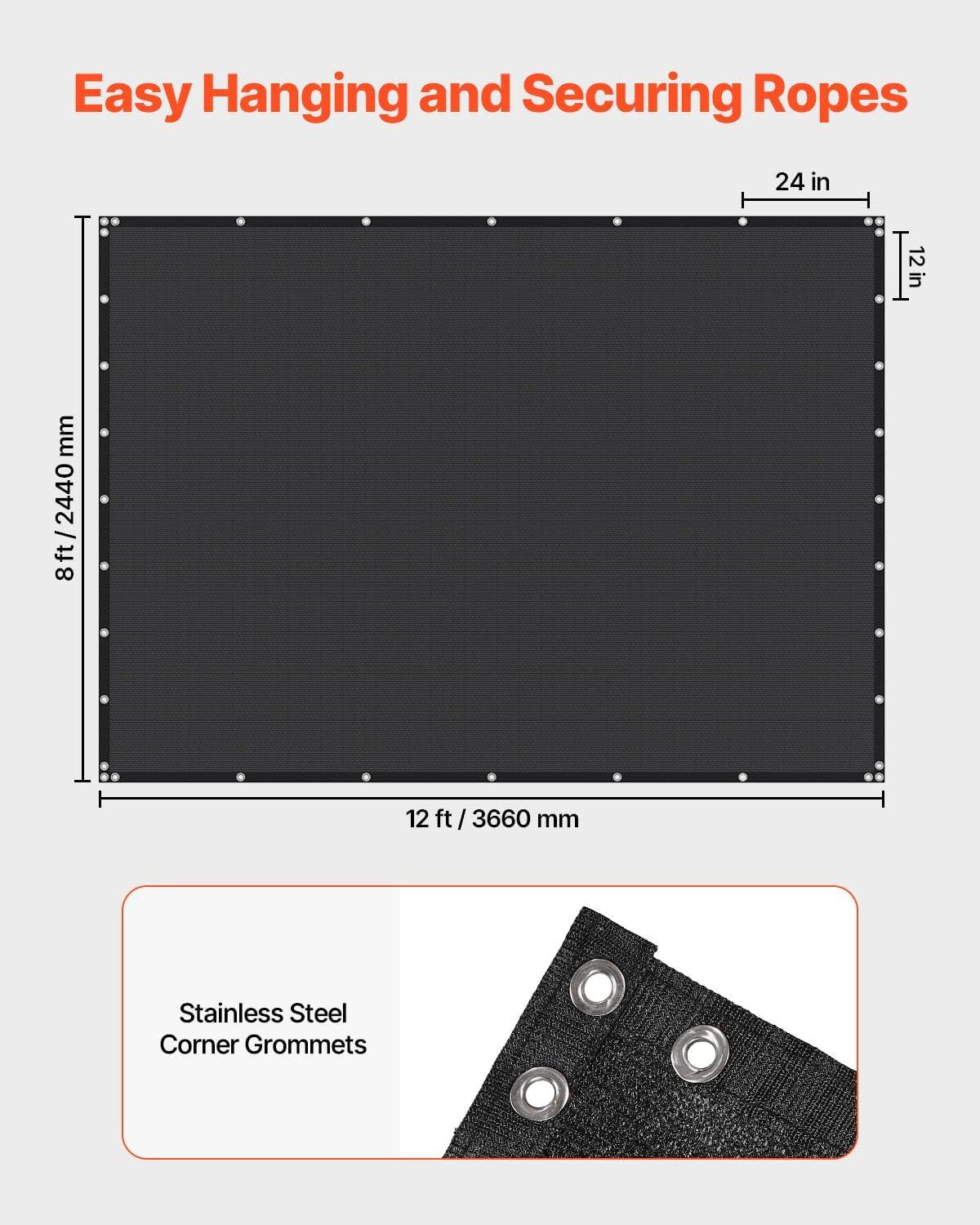 Stainless Steel Grommets: The shade screen measures 8 x 12 ft / 2440 x 3660 mm, reinforced with high-quality grommets. Each corner has 3 grommets, spaced 24 in / 2 ft horizontally and 12 in / 1 ft vertically, ensuring easy hanging and securing
