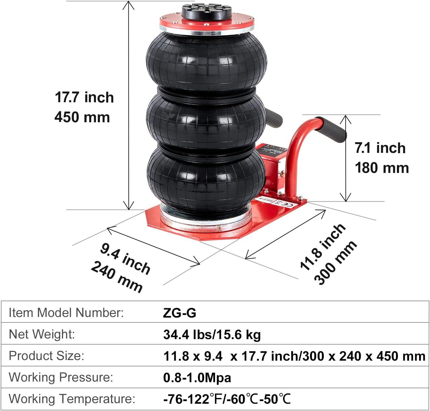 Labor-Saving Jack: Pneumatic jack capacity: 6600 lbs/3T. Minimum height: 5.3″/135 mm. Maximum height: 15.75″/400 mm. It only takes 5 seconds to lift. Working Temp: -60℃~ 50 ℃. Air inlet: G1/4. Our triple bag jack is the easiest and fastest way to make the car lift.