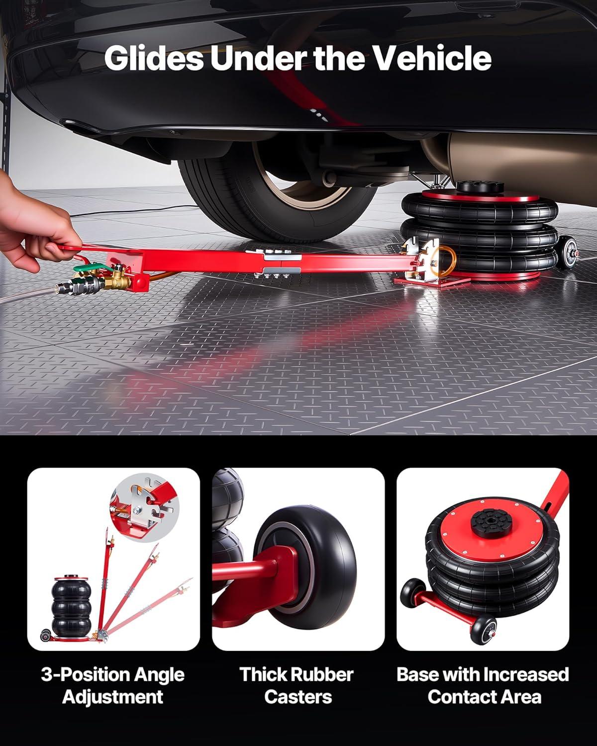 Moves Easily Under Vehicles: Equipped with an adjustable-angle handle and rubber wheels, the car air jack can easily slide under your car or reach deeper support points at 45° or 180° angles. The 90° position makes it compact and convenient for storage
