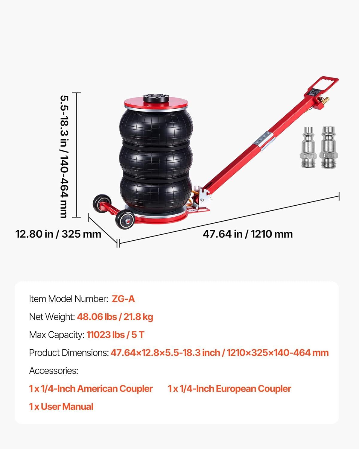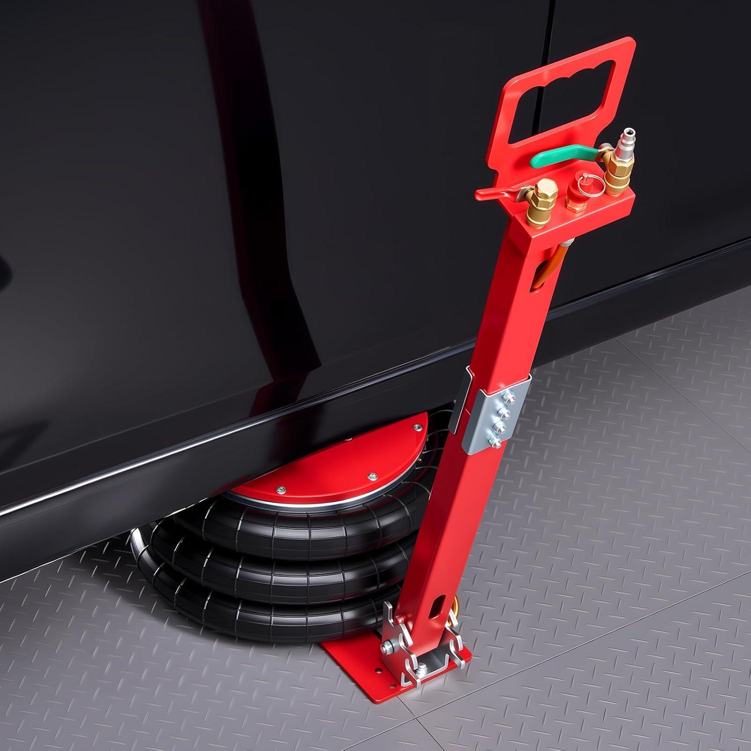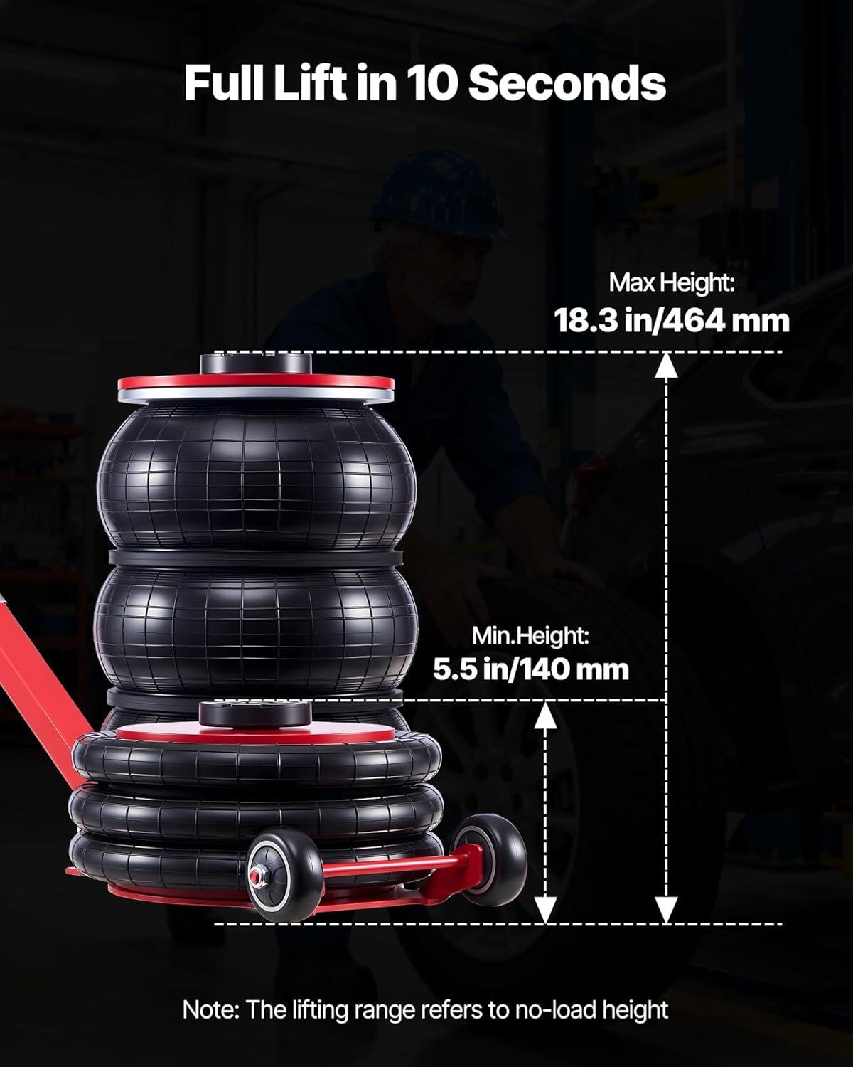 Fast Air Lift in Seconds: The air jack lifts 5.5-18.3 in/140-464 mm under no load. It raises your car in 4-10 seconds when connected to an air compressor, great for tire changes, undercarriage repairs & oil swaps. Use with a jack stand for long support