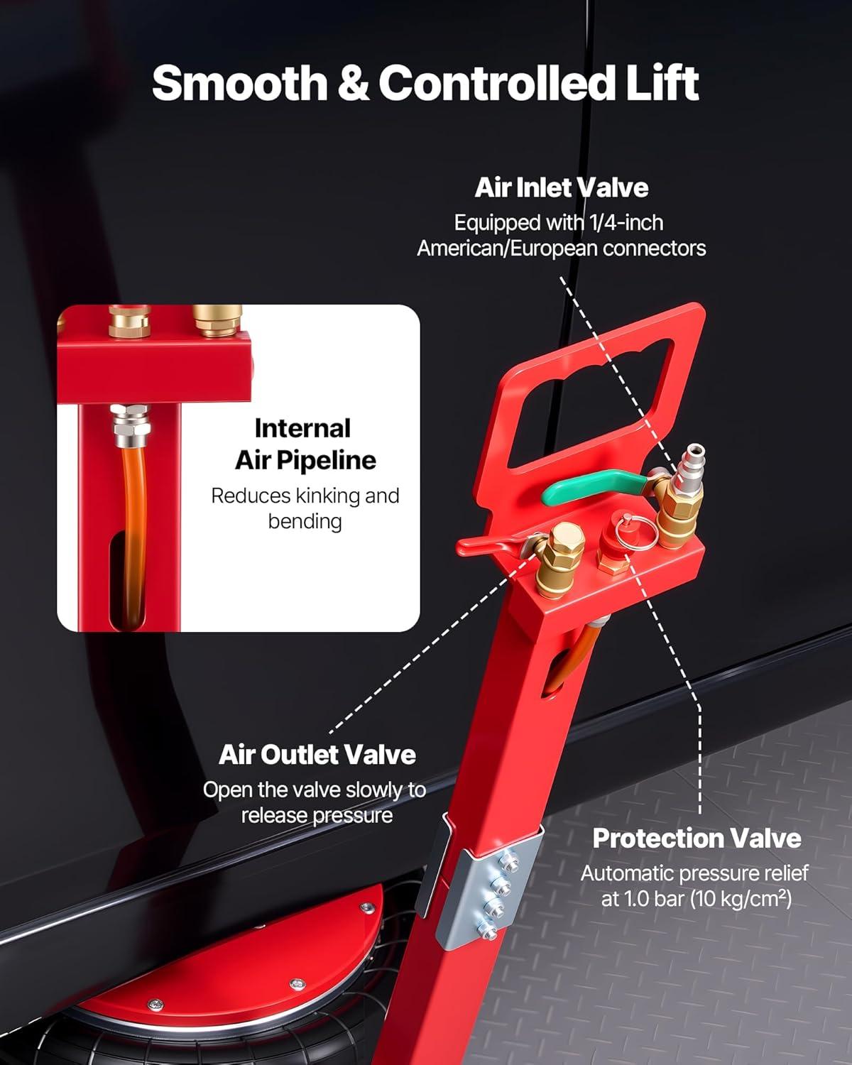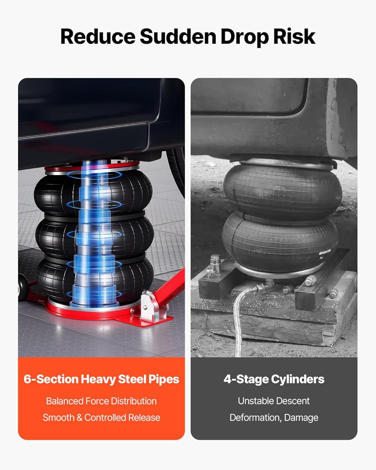 Controlled & Safe Descent: The air bag jack features six heavy-duty steel pipes inside, each with a shorter stroke for smooth, steady lowering and precise height control. It stops sudden drops, distributes weight evenly, and avoids deformation or tilting