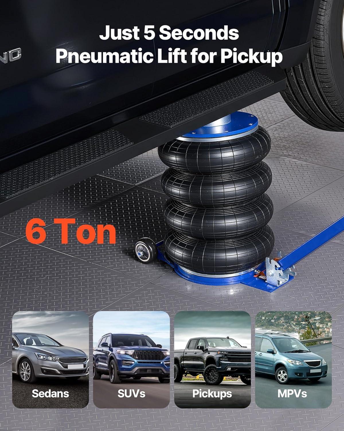 5-Ton Heavy Load Capacity: This airbag jack supports up to 5 tons/11023 lbs, suitable for sedans, SUVs, pickups, and trucks. Its reinforced triple-layer airbag and widened base plate ensure strong, stable lifting performance