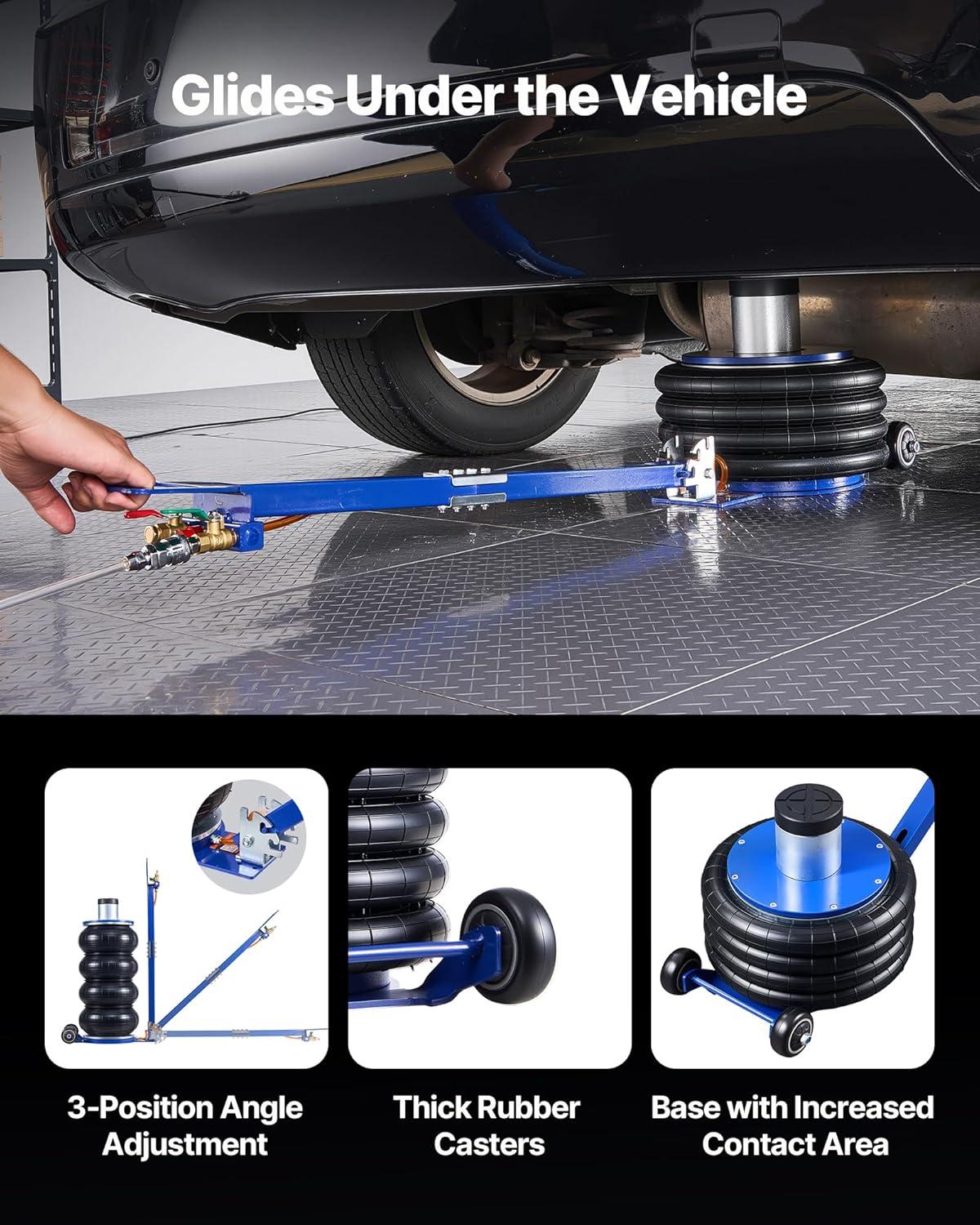 Moves Easily Under Vehicles: Equipped with an adjustable-angle handle and rubber wheels, the car air jack can easily slide under your car or reach deeper support points at 45° or 180° angles. The 90° position makes it compact and convenient for storage