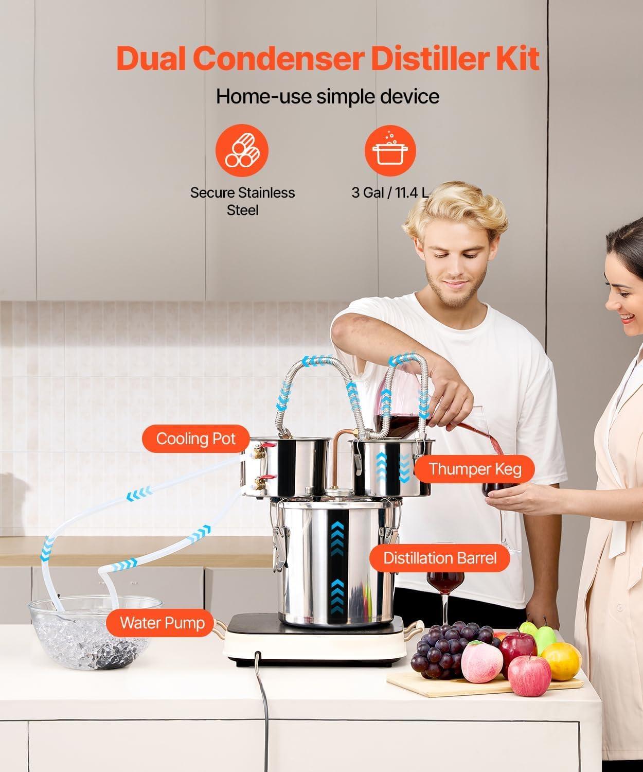 VEVOR Alcohol Still, 5Gal / 19L Alcohol Distiller with Thumper Keg, Distillery Kit for Alcohol with Copper Tube, Build-in Thermometer & Water Pump for Wine Whisky Brandy(3 Gal)