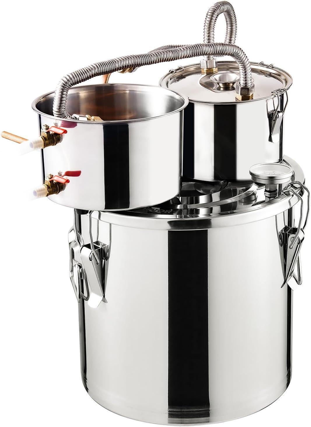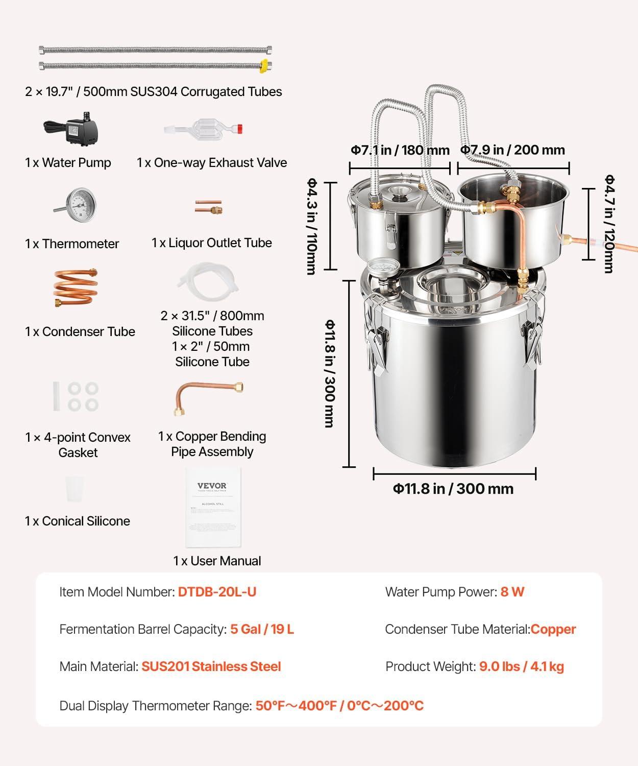 VEVOR Alcohol Still, 5Gal / 19L Alcohol Distiller with Thumper Keg, Distillery Kit for Alcohol with Copper Tube, Build-in Thermometer & Water Pump for Wine Whisky Brandy(5 Gal)
