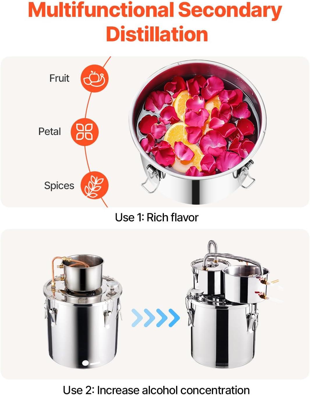 5Gal Dual Condenser Distiller Kit: We offer a complete kit for this flavor-enhancing distiller, ideal for brewing fruit wines, whiskies, brandies, champagnes, vodkas, water, ethanol, and other distilled products at home. The main components include a fermentation barrel, barrel lid, cooling pot, and thumper keg. The fermentation barrel comes in multiple sizes: 3Gal, 5Gal, 8Gal, 13.2Gal, catering perfectly to family gatherings or parties with friends.