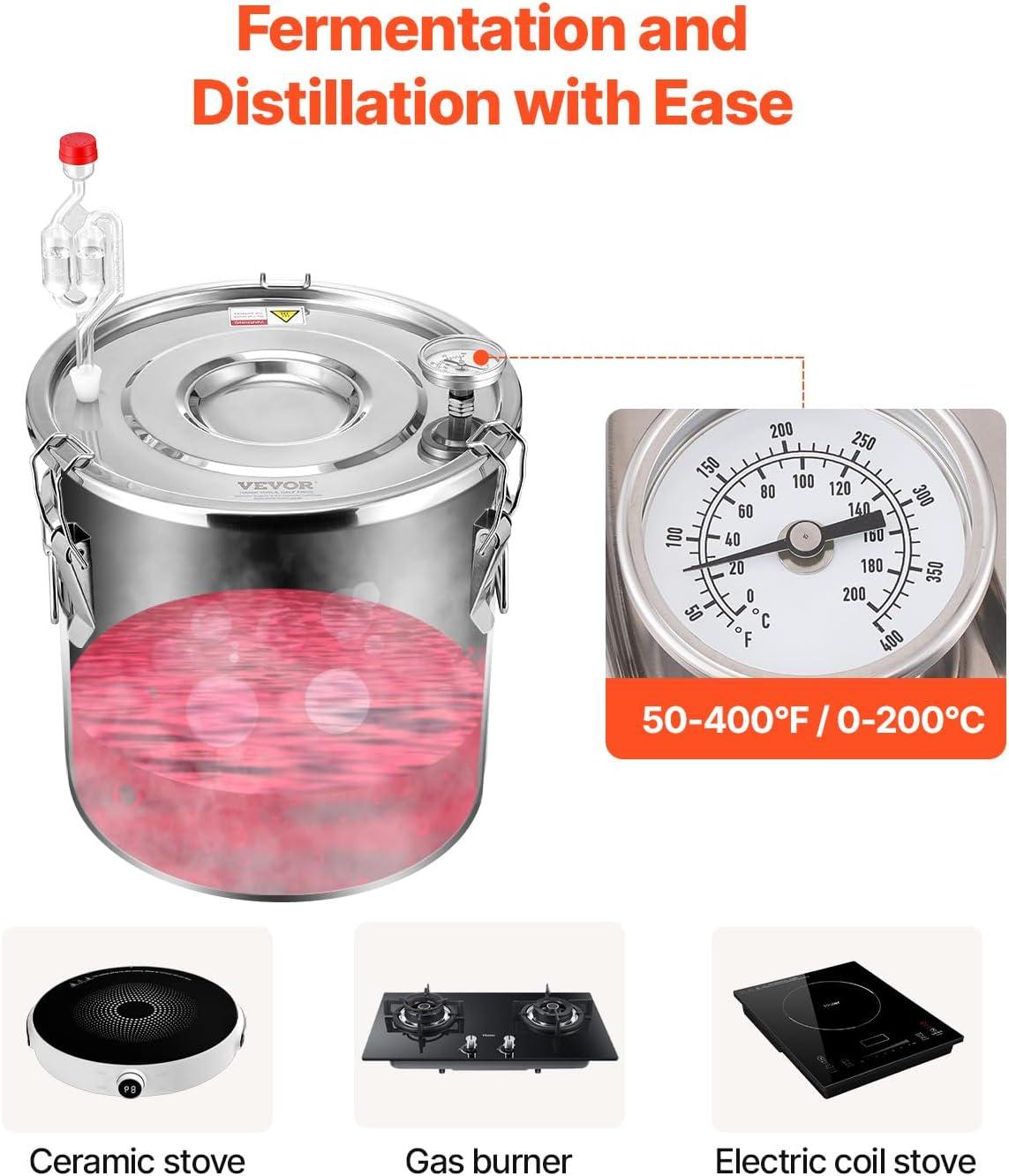 Secure Fermentation and Heating: The fermentation barrel is convenient to use. A unidirectional exhaust valve releases gases produced during fermentation, reducing internal pressure. The thickened stainless steel bottom is compatible with various heating methods such as wood fire, gas stoves, and gas stoves, preventing deformation and damage. The temperature gauge on the lid displays Celsius and Fahrenheit temperatures, facilitating temperature monitoring during distillation.