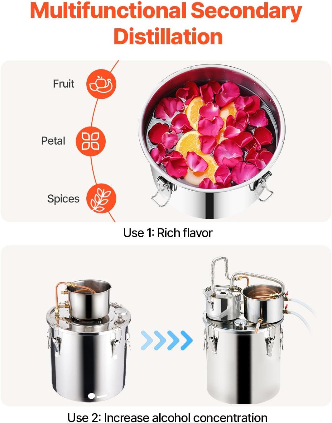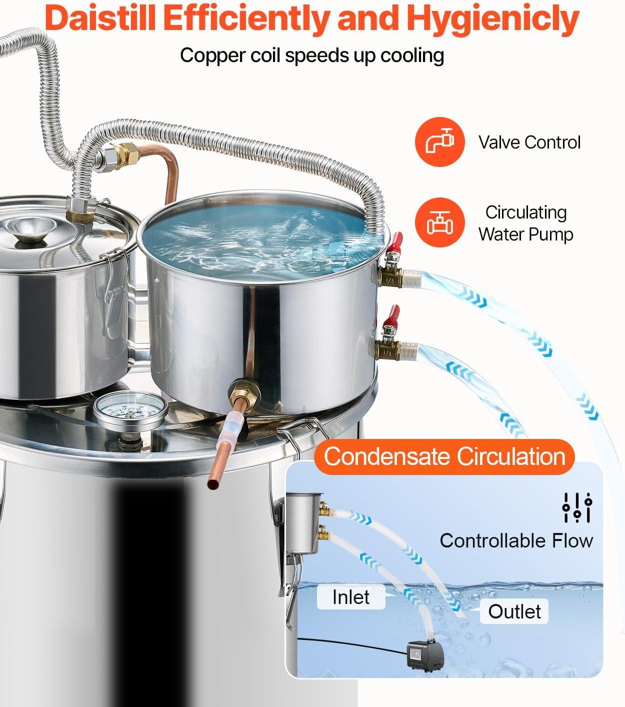 Quick and Efficient Cooling: The cooling and distillation process uses copper tube with good thermal conductivity to accelerate cooling. The smooth and wrinkle-free interior of the pipes prevents residues of distilled alcohol and water, ensuring no aftertaste. A water pump facilitates cooling water circulation for thorough and efficient cooling.