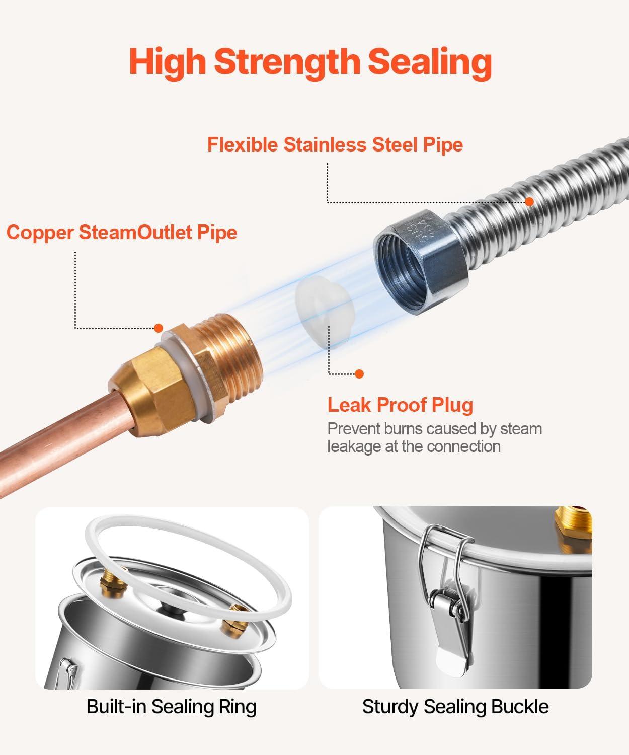 Secure Sealing: Silicone leak-proof plugs are added at the corrugated pipe joints to prevent leaks of water vapor, reducing the risk of burns and other injuries. Use a wrench to tighten connections securely during assembly. The fermentation barrel lid features four fixed sealing latches with built-in seals, ensuring hygiene and optimal fermentation results.