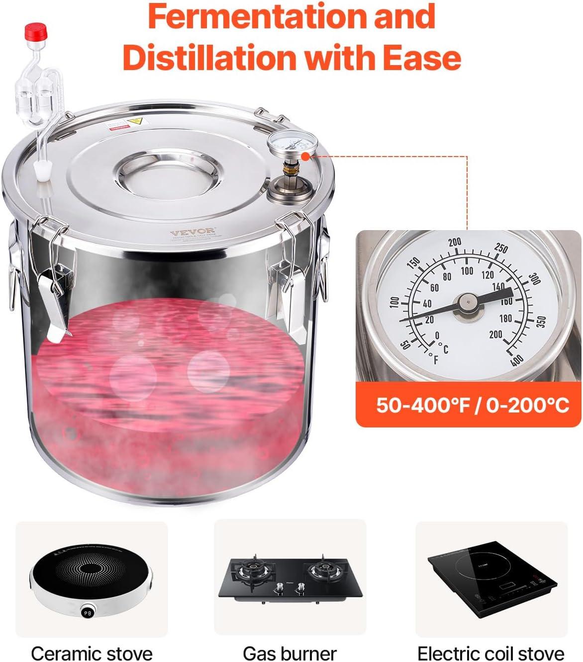 Secure Fermentation and Heating: The fermentation barrel is convenient to use. A unidirectional exhaust valve releases gases produced during fermentation, reducing internal pressure. The thickened stainless steel bottom is compatible with various heating methods such as wood fire, gas stoves, and gas stoves, preventing deformation and damage. The temperature gauge on the lid displays Celsius and Fahrenheit temperatures, facilitating temperature monitoring during distillation.