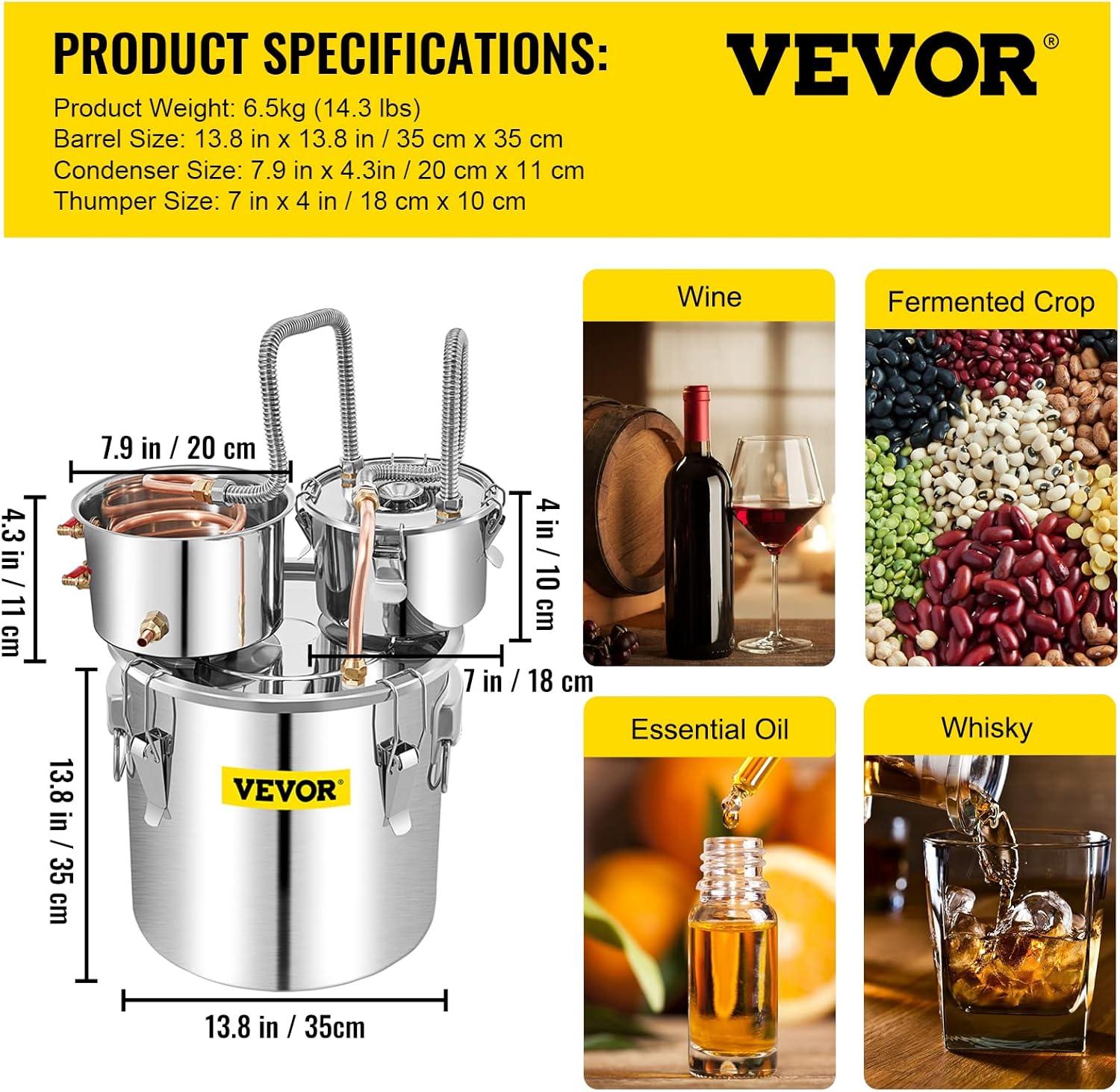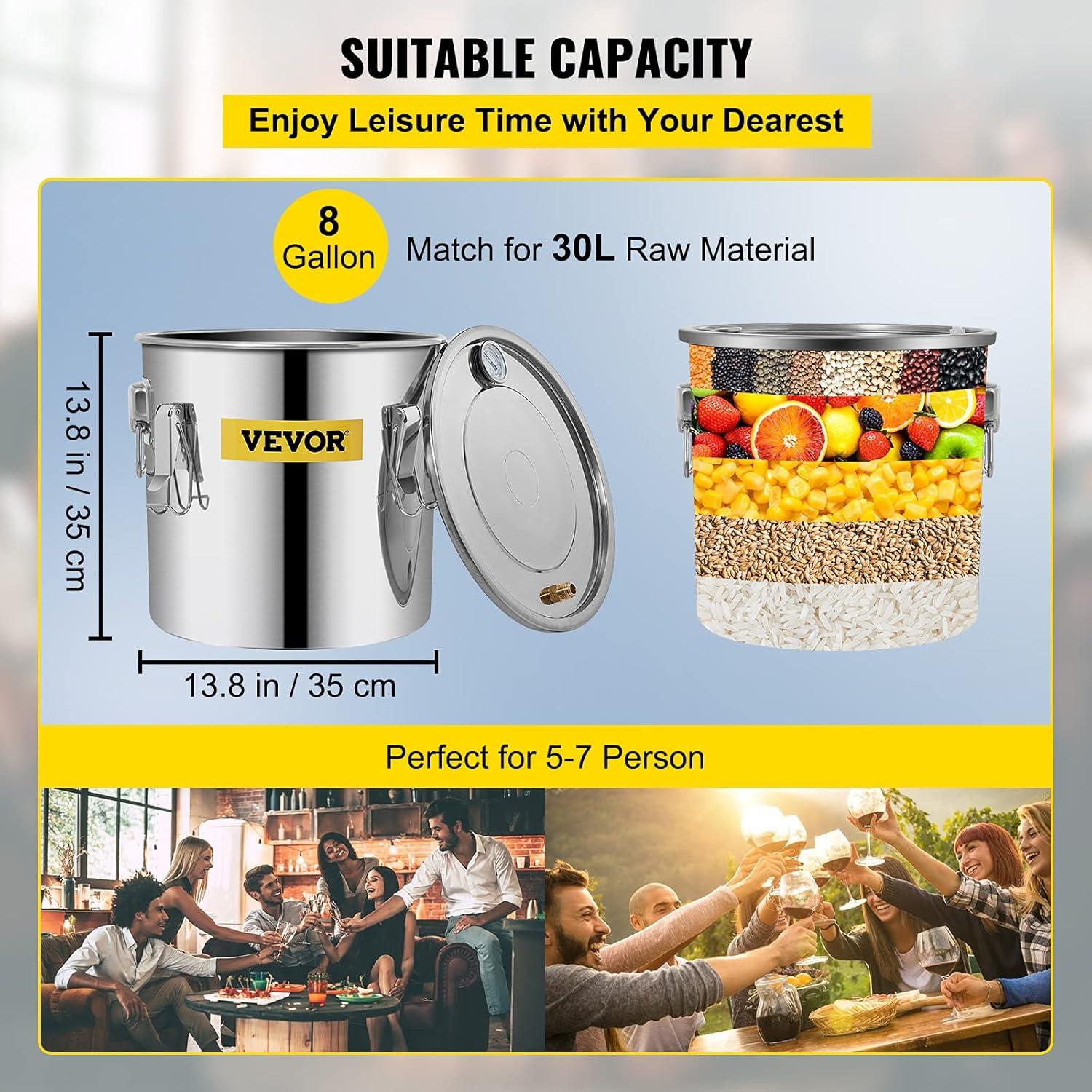 Still 8 Gal/ 30L Stainless Steel Water Alcohol Distiller Copper Tub Home Brewing Kit Build-in Thermometer for DIY Whisky Wine Brandy still machine owns 9. 6 us gal real capacity, able to distill 30 liters of raw material by heating to selectively boil and then cooling to condense the vapor. Boiler barrel: 13.8″ X 13.8″ (35 x 35 cm). condenser: 7. 9″ X 4.3″ (20 x 11 cm). thumper: 7. 9″ X 4.3″ (20 x 11 cm). all parts are made of food grade material including silicone, stainless steel and copper. Complete set of alcohol still, great for both beginners and experts, very easy to set up and use.It can be used for distilling fruit wine, water, brandy and refining plant extracts for medicinal purposes. This pot still can be heated by induction cooker, stove or any other heating sources.Double kegs for better distilling results. Features: Durable and Sufficient Rapid Cooling Convenient Thermometer Efficient Cycling Dependable and Secure Multipurpose Usage Parameter. Boiler Barrel: 8 US GAL (30L), 13.8″ x 15.7″ (35 x 35 cm),Condenser Keg: 7. 9″ X 4.3″ (20 x 11 cm), Material: Stainless steel+red copper, Gross Weight: 15.8 lb (7.2 kg), Package Dimensions (L x W x H): 18″ x 18.5″ x 18.5″ (46 x 47 x 47 cm), Thumper Keg: 7″ x 4.3″ (18 x 10 cm). Package Information:1 x Alcohol Distiller, 1 x Condenser Keg, 1 x Thermometer, 1 x One-way Air Evacuation Valve,1 x Thumper Keg, 1 x Water Circulating Pump, 1 x Manual