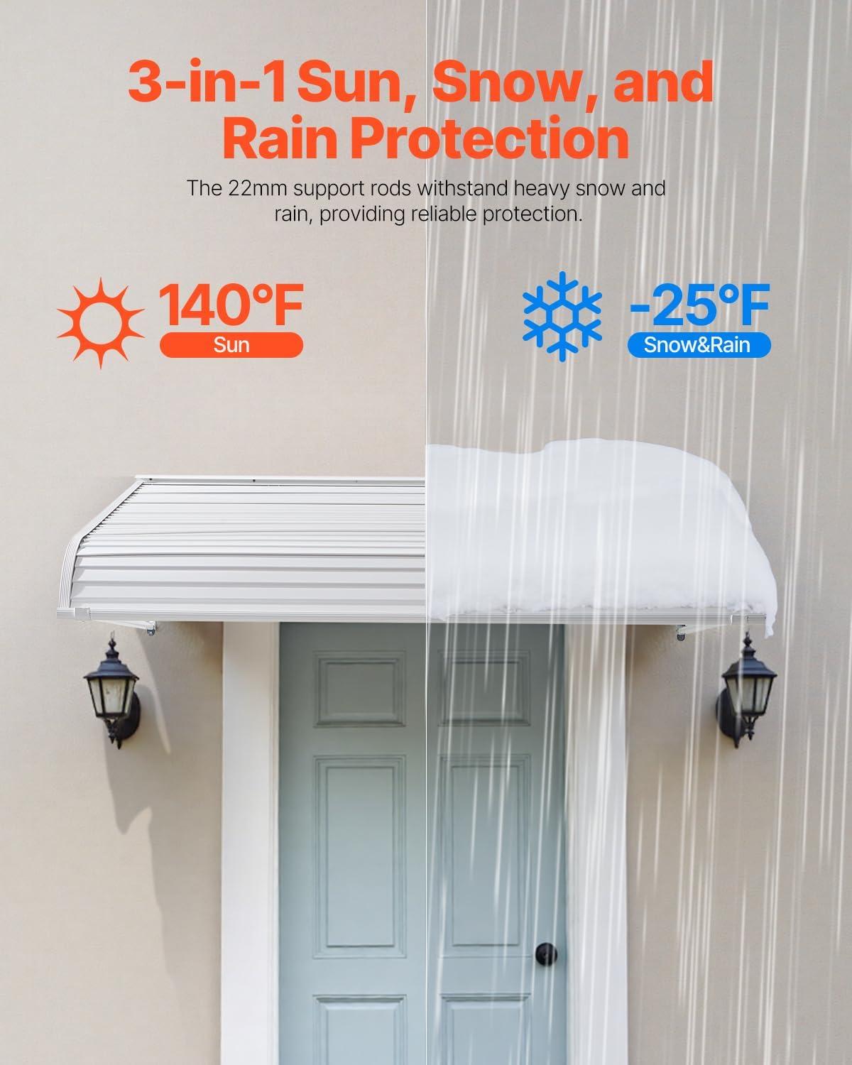 All-Season Protection: The 48×42-inch fixed metal door awning offers strong protection against sun, rain, and snow, preventing sunlight damage to car paint and doors while keeping your outdoor items safe from the elements.