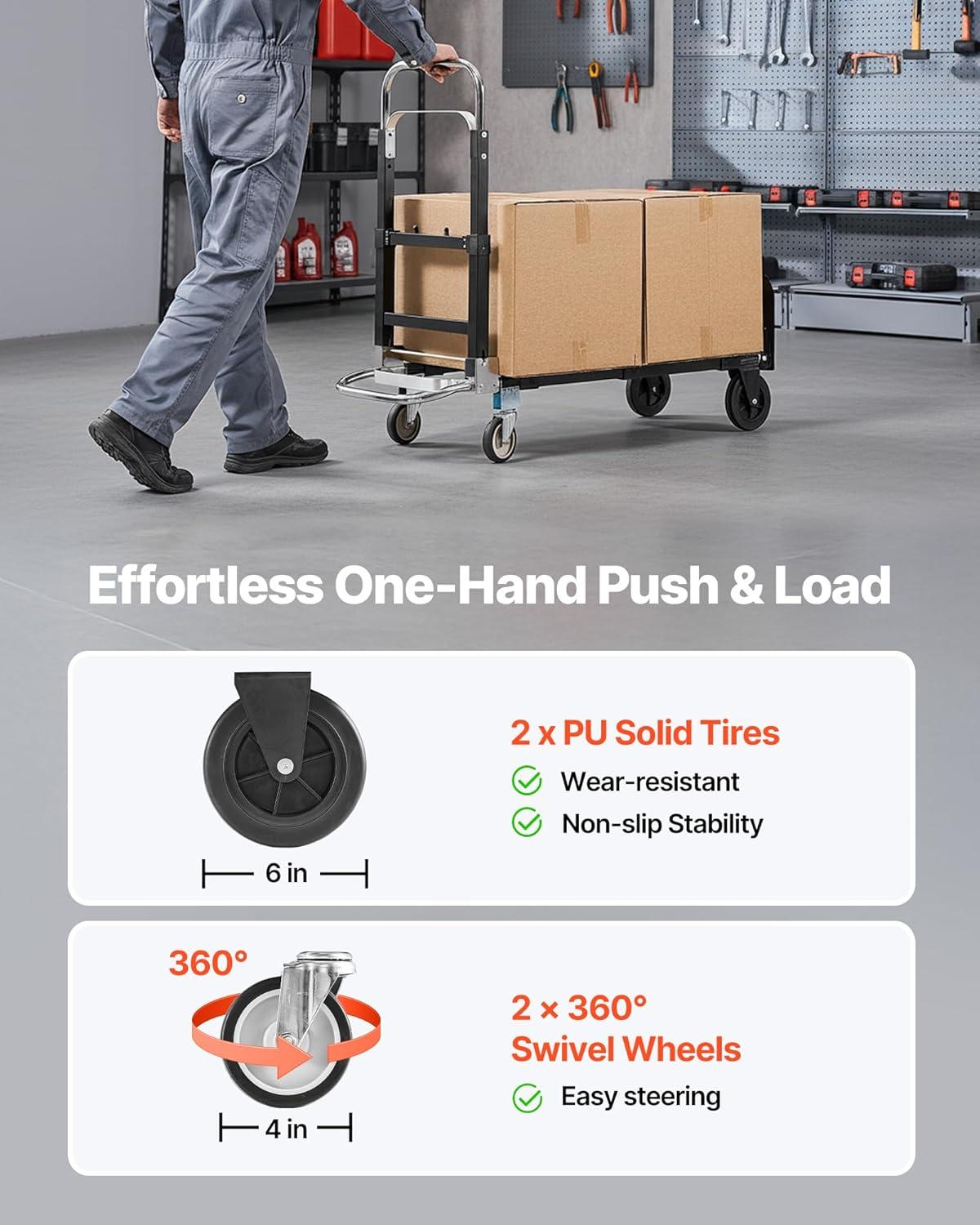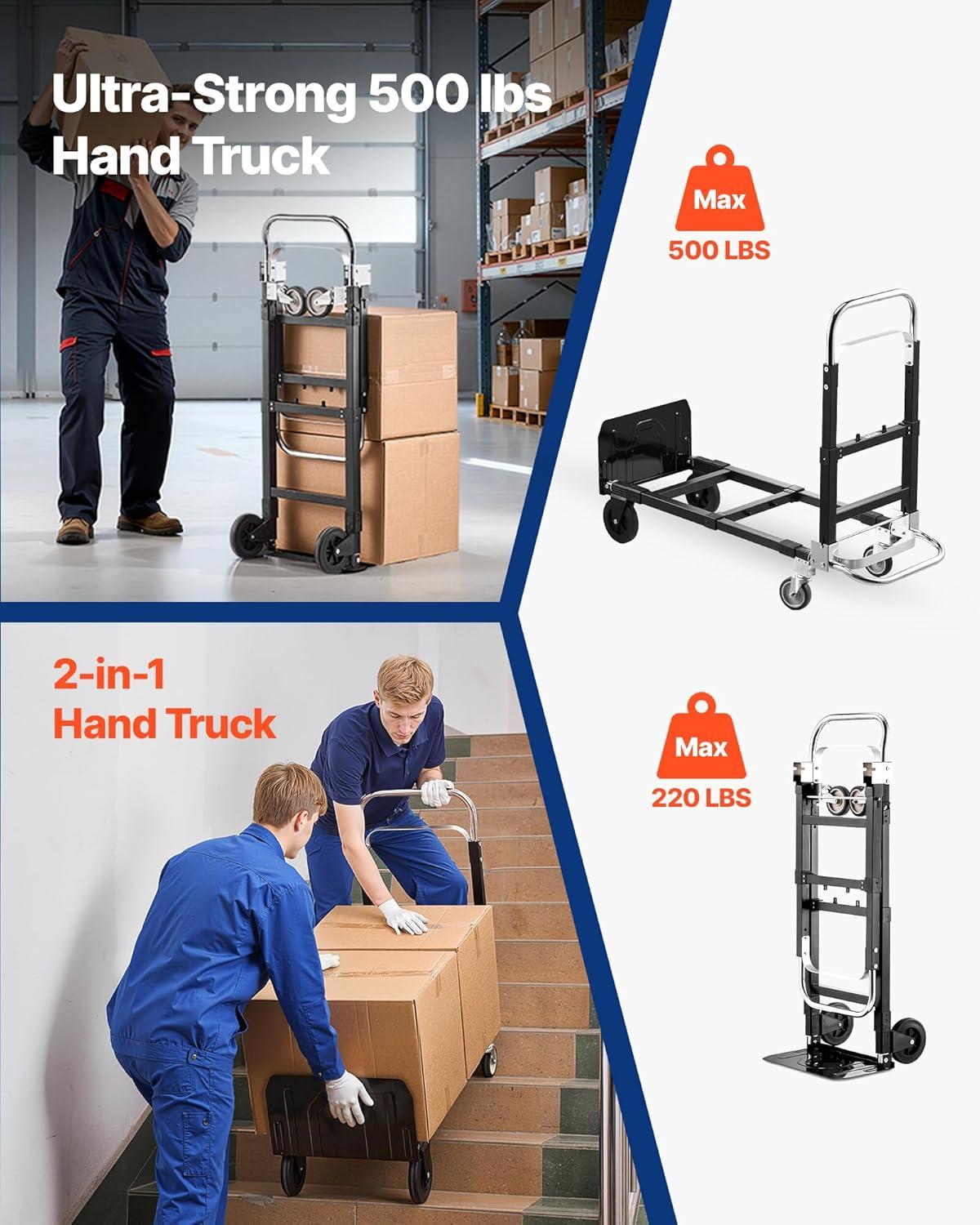 VEVOR Aluminum Truck, 2 in 1, 800 lbs Load Capacity, Heavy Duty Industrial Convertible Folding Hand Truck and Dolly, Utility Cart Converts from Hand Truck to Platform Cart with Rubber Wheels(500LBS - 2 in 1)