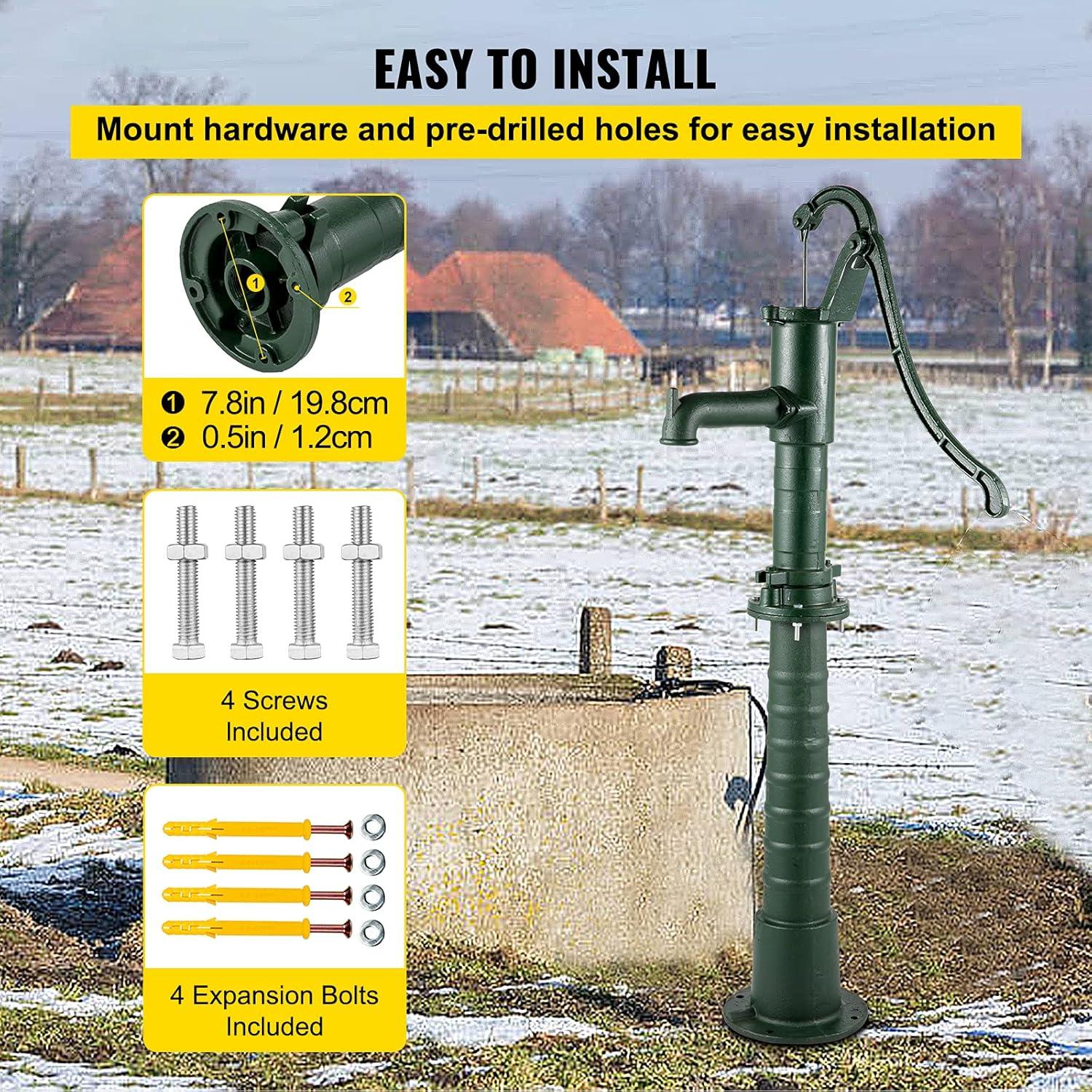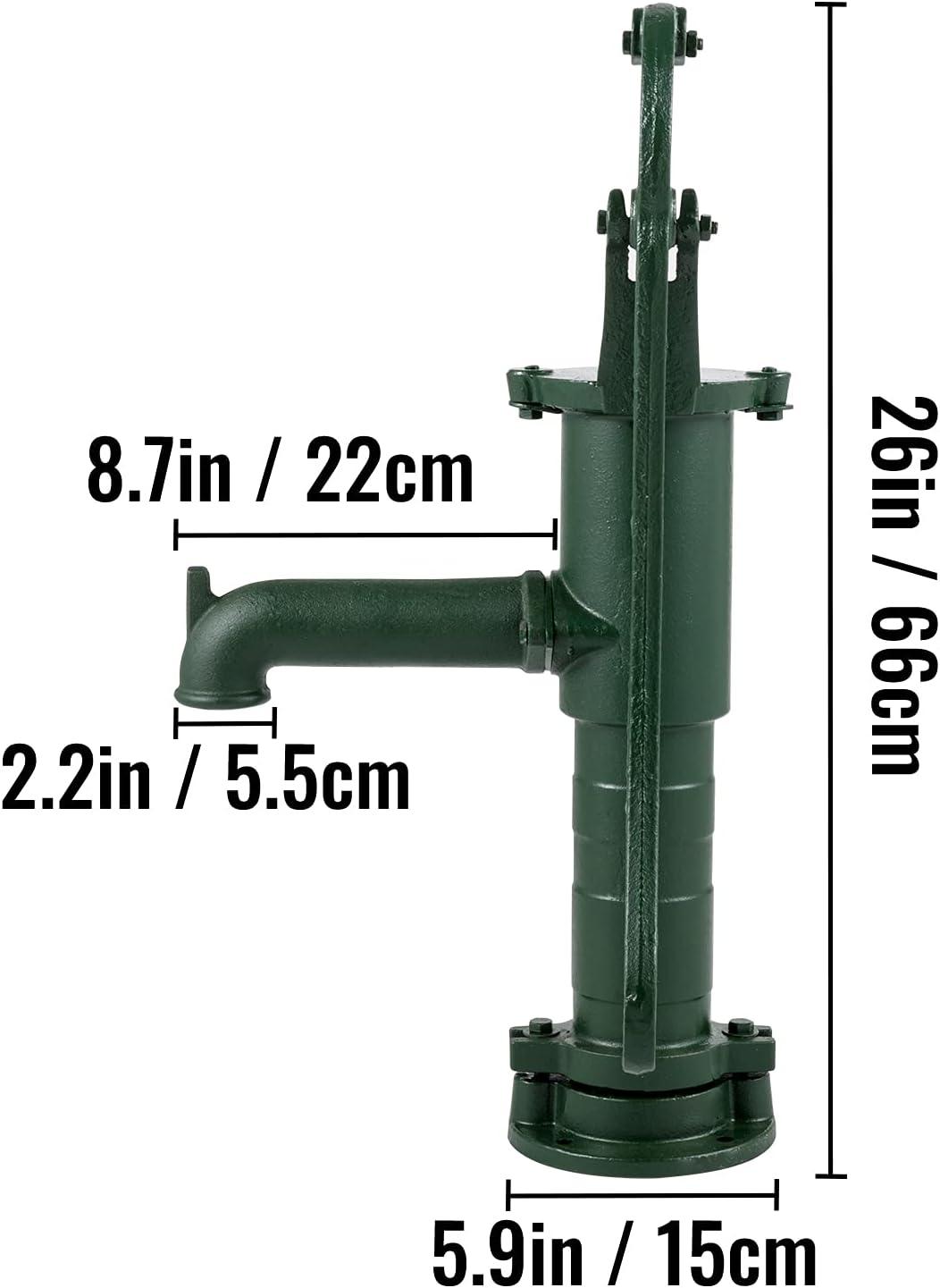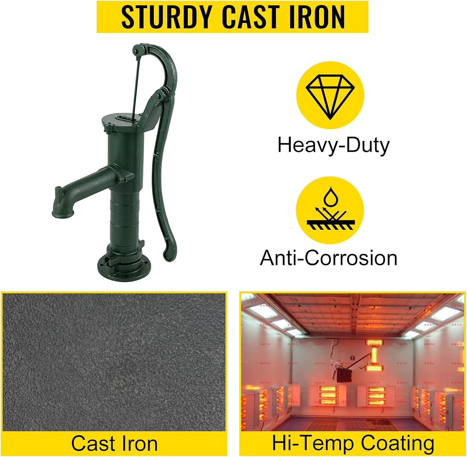 VEVOR Antique Hand Water Pump 14.6 x 5.9 x 25.6 inch Pitcher Pump w/Handle Cast Iron Well Pump w/Pre-set 0.5" Holes for Easy Installation Old Fashion Pitcher Hand for Yard Ponds Garden Black(Green)