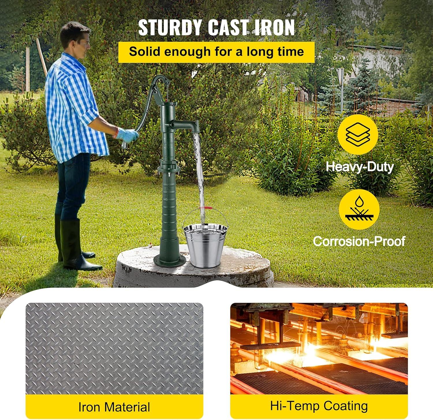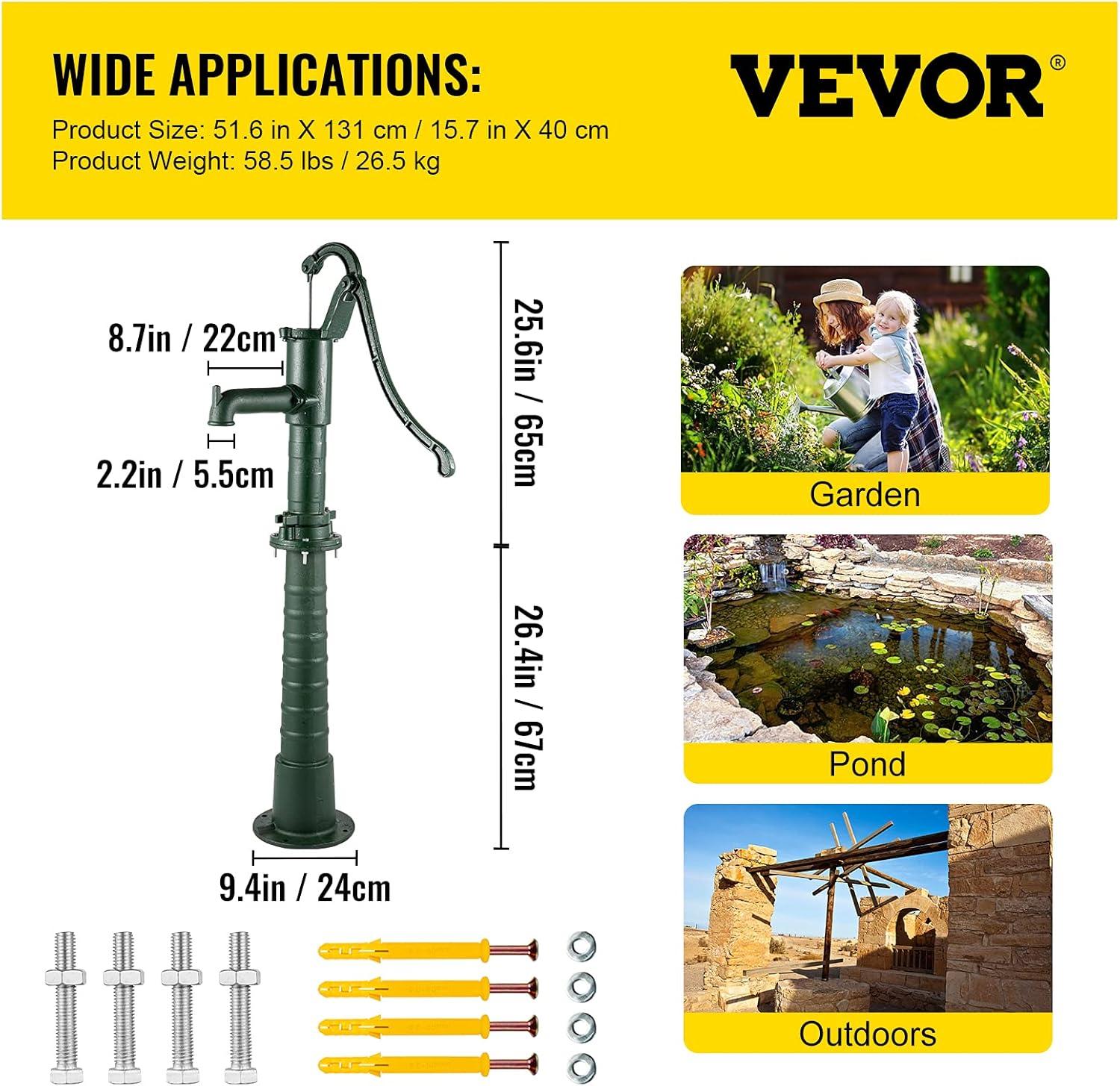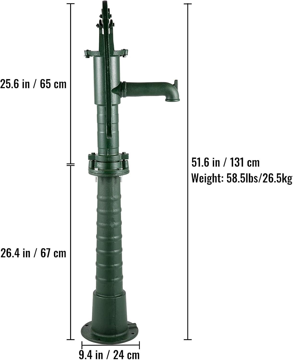 VEVOR Antique Hand Water Pump 14.6 x 5.9 x 25.6 inch Pitcher Pump w/Handle Cast Iron Well Pump w/Pre-set 0.5" Holes for Easy Installation Old Fashion Pitcher Hand for Yard Ponds Garden Black(Green)