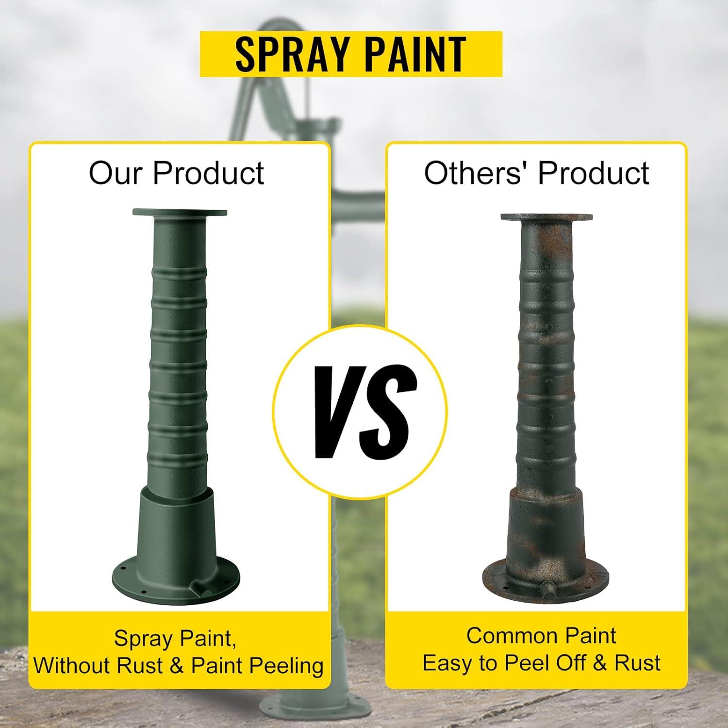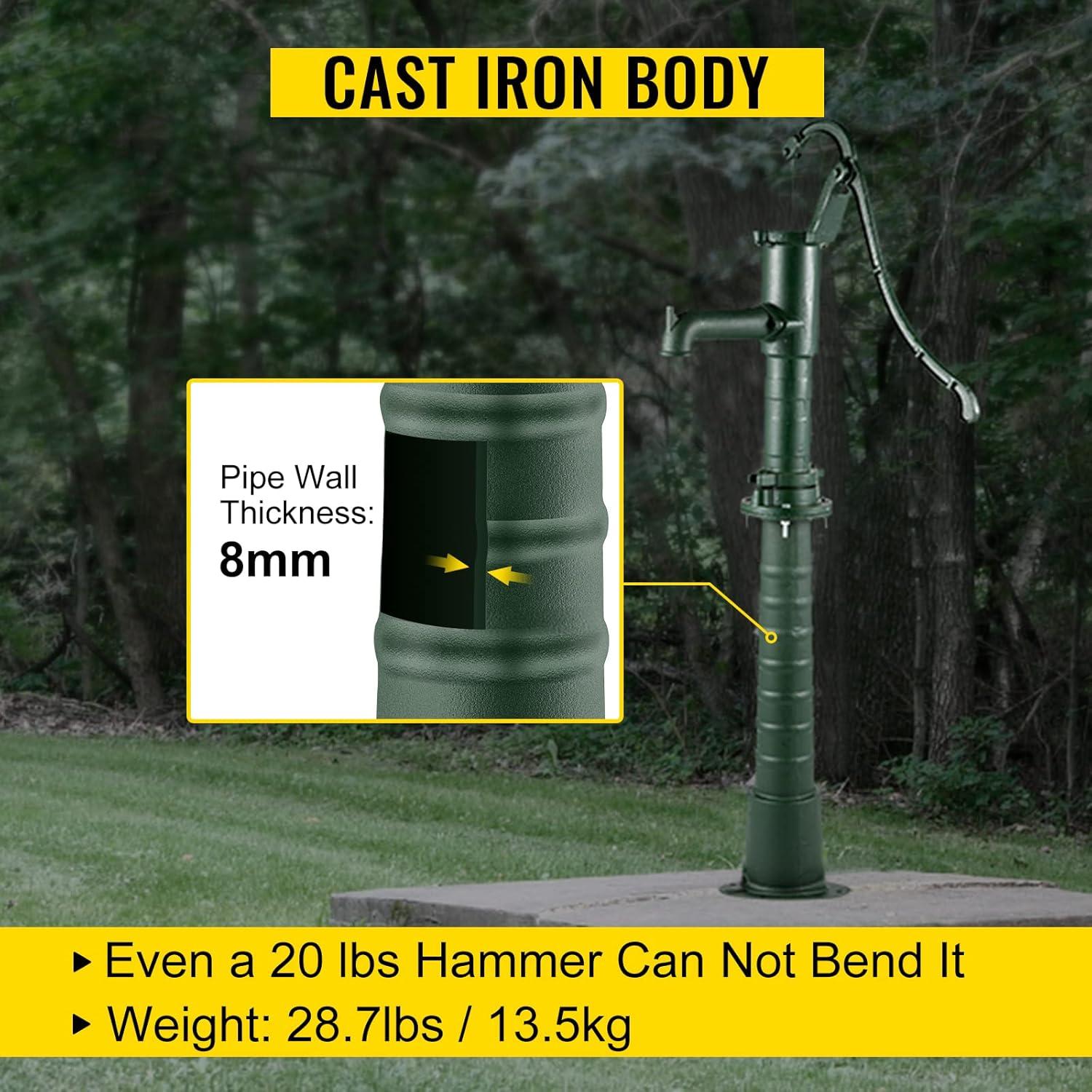 Cast Iron Material: The hand water pump is made of cast iron with rust-proof spray paint, which is durable and sturdy. 8mm thick pipe wall can even withstand the shock of a 20lbs hammer.