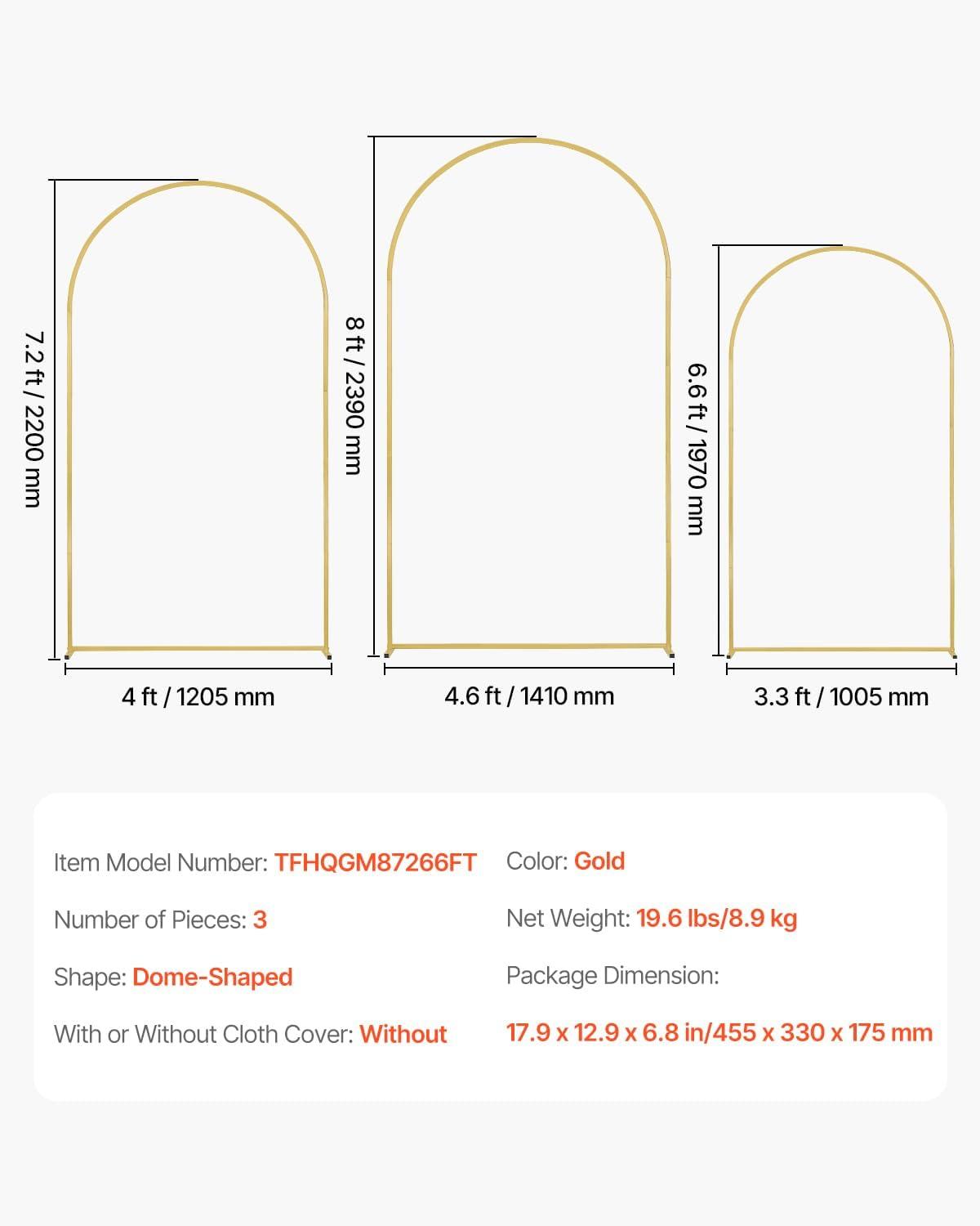 VEVOR Arch Backdrop Stand, 6Ft, 5Ft & 4Ft, Set of 3 Balloon Metal Arch Stand for Ceremony, Gold Wedding Arch Backdrop Stand, Fit for Birthday Party, Baby Shower, Graduations, Holiday(7.2ft 6ft)