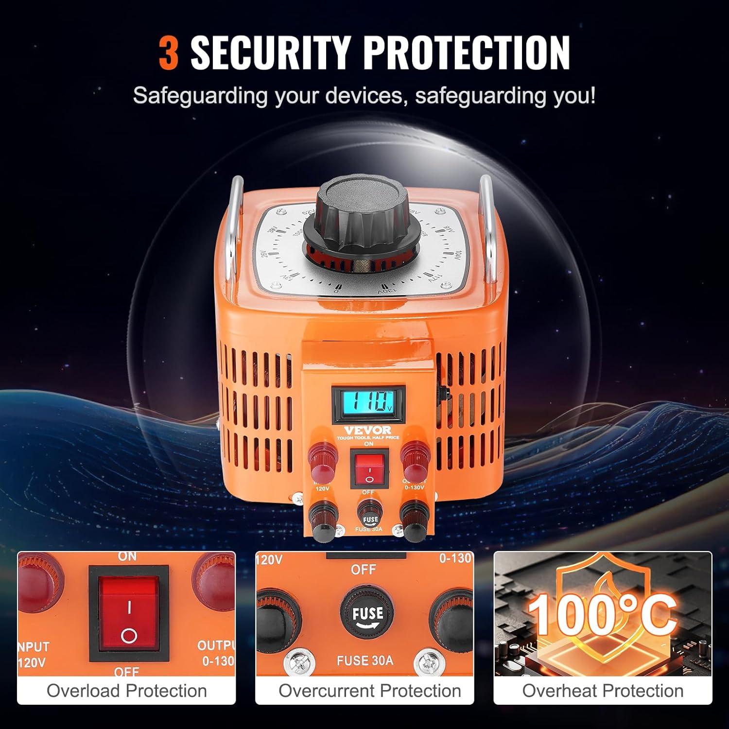 Multiple Security Protections: Our variable voltage transformer is engineered with your security in mind, featuring fuses, a thermal control switch, and a resettable overload protector, extending uninterrupted protection to your equipment. Ideal for both household and industrial applications, our transformer creates a secure and stable voltage environment for all your devices.