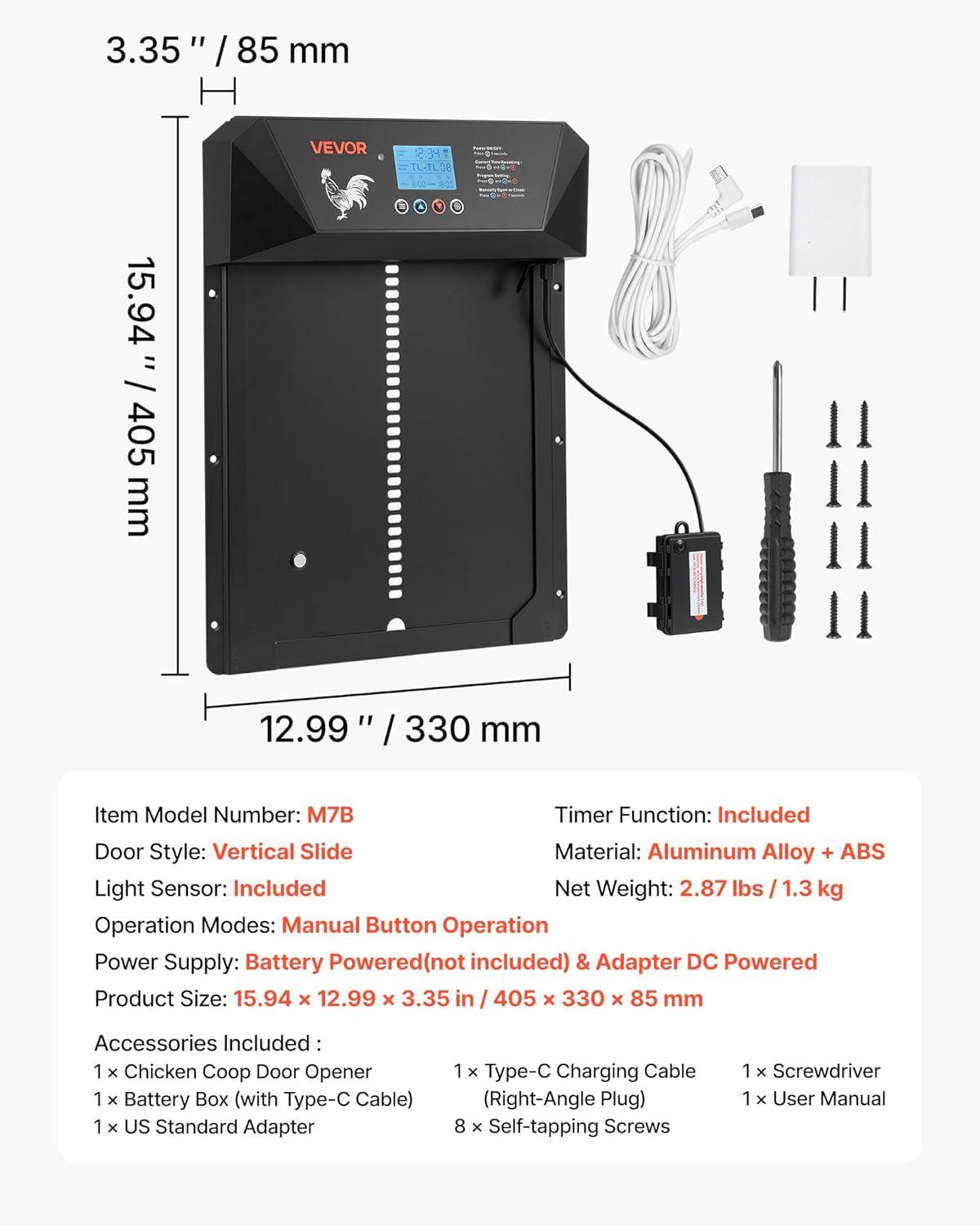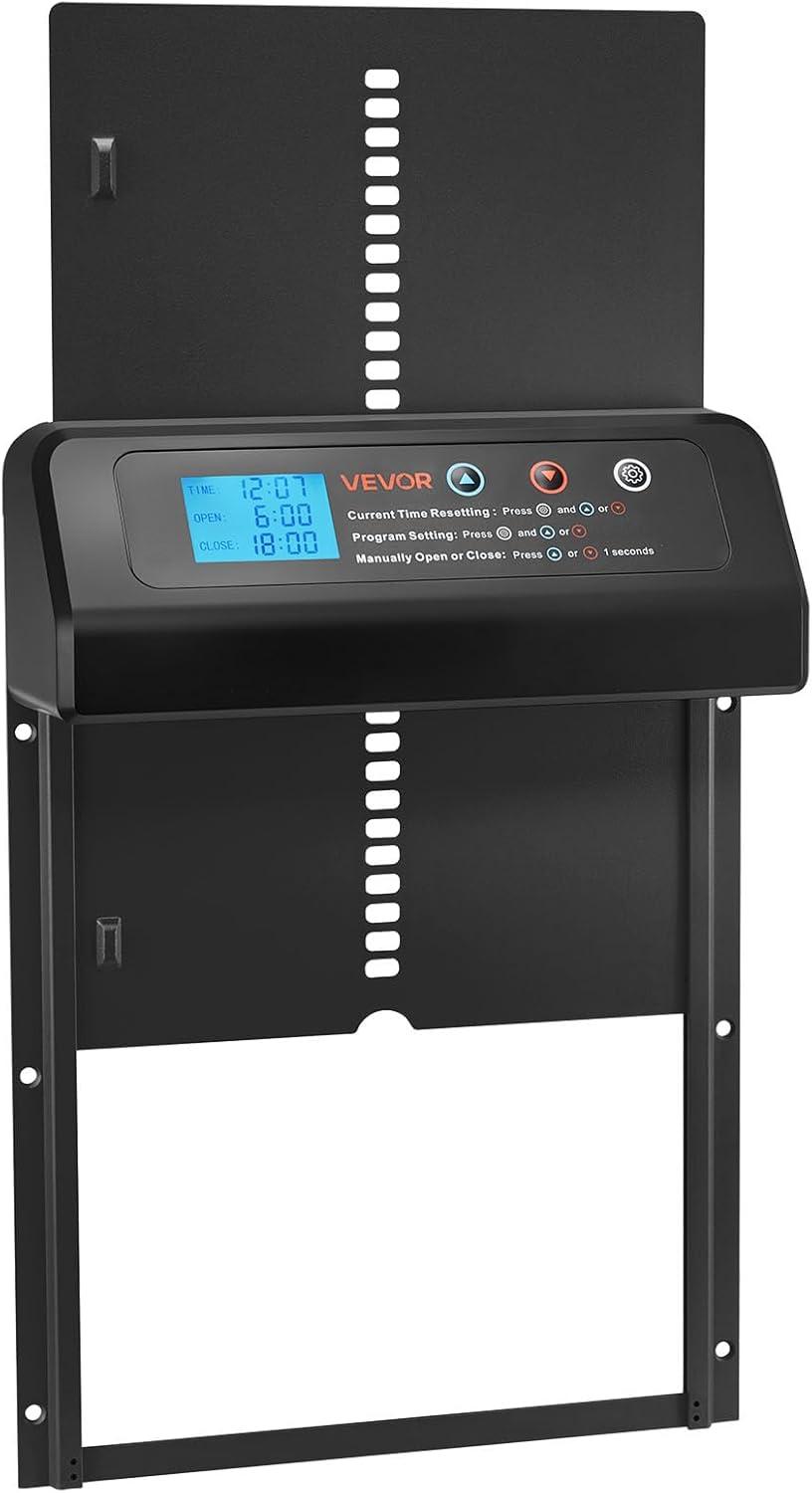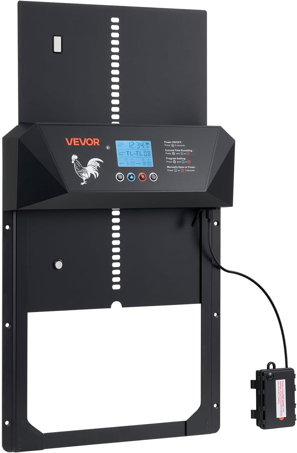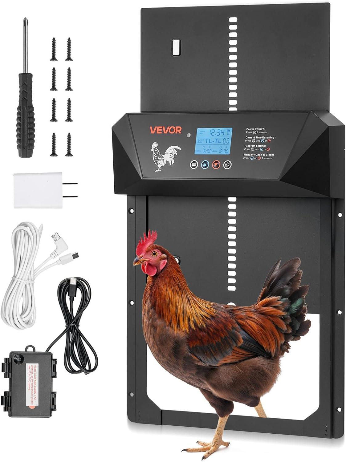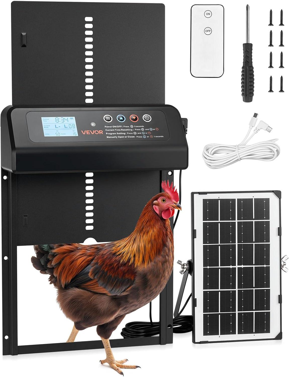 Get more for your money with our exclusive bundle deals on VEVOR Automatic Chicken Coop Door, Auto Chicken Door Opener with Timer & Light Sensor Aluminum Chicken Coops Door with Remote Control and LCD Screen, 4 Modes Opening, Battery or DC Powered(Black) and accessories.