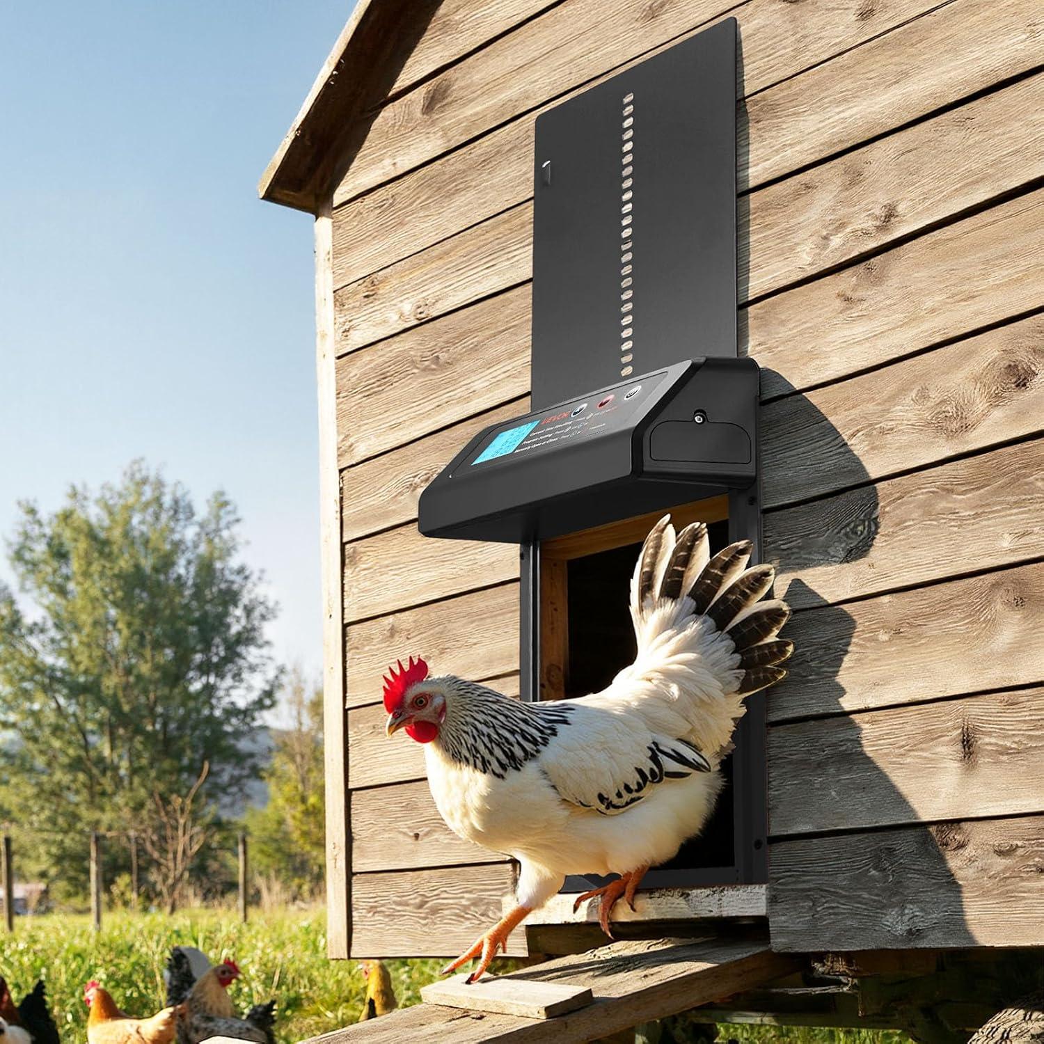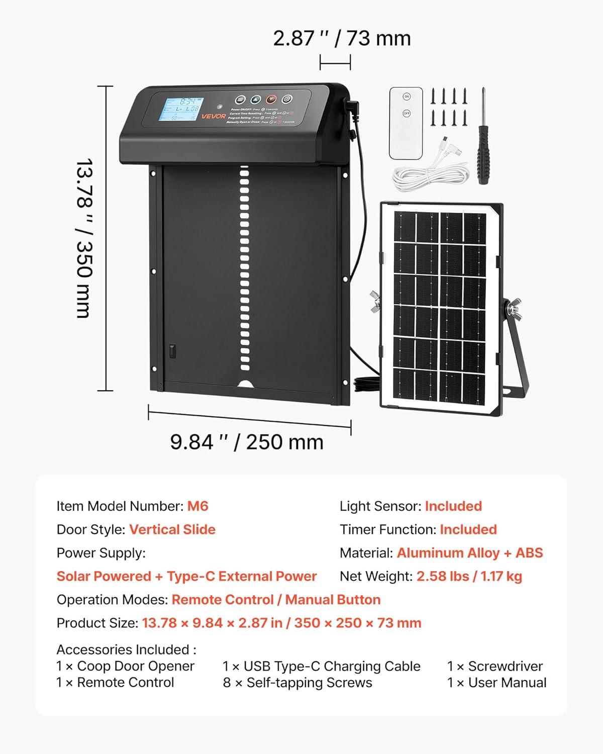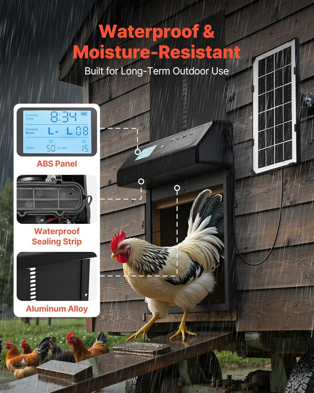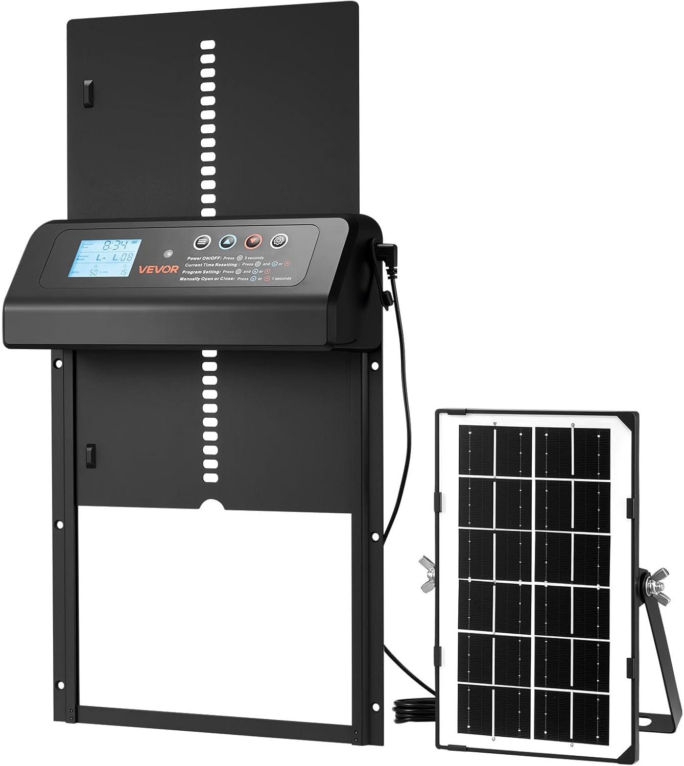 Get more for your money with our exclusive bundle deals on VEVOR Automatic Chicken Coop Door, Auto Chicken Door Opener with Timer & Light Sensor Aluminum Chicken Coops Door with Remote Control and LCD Screen, 4 Modes Opening, Battery or DC Powered(Black) and accessories.