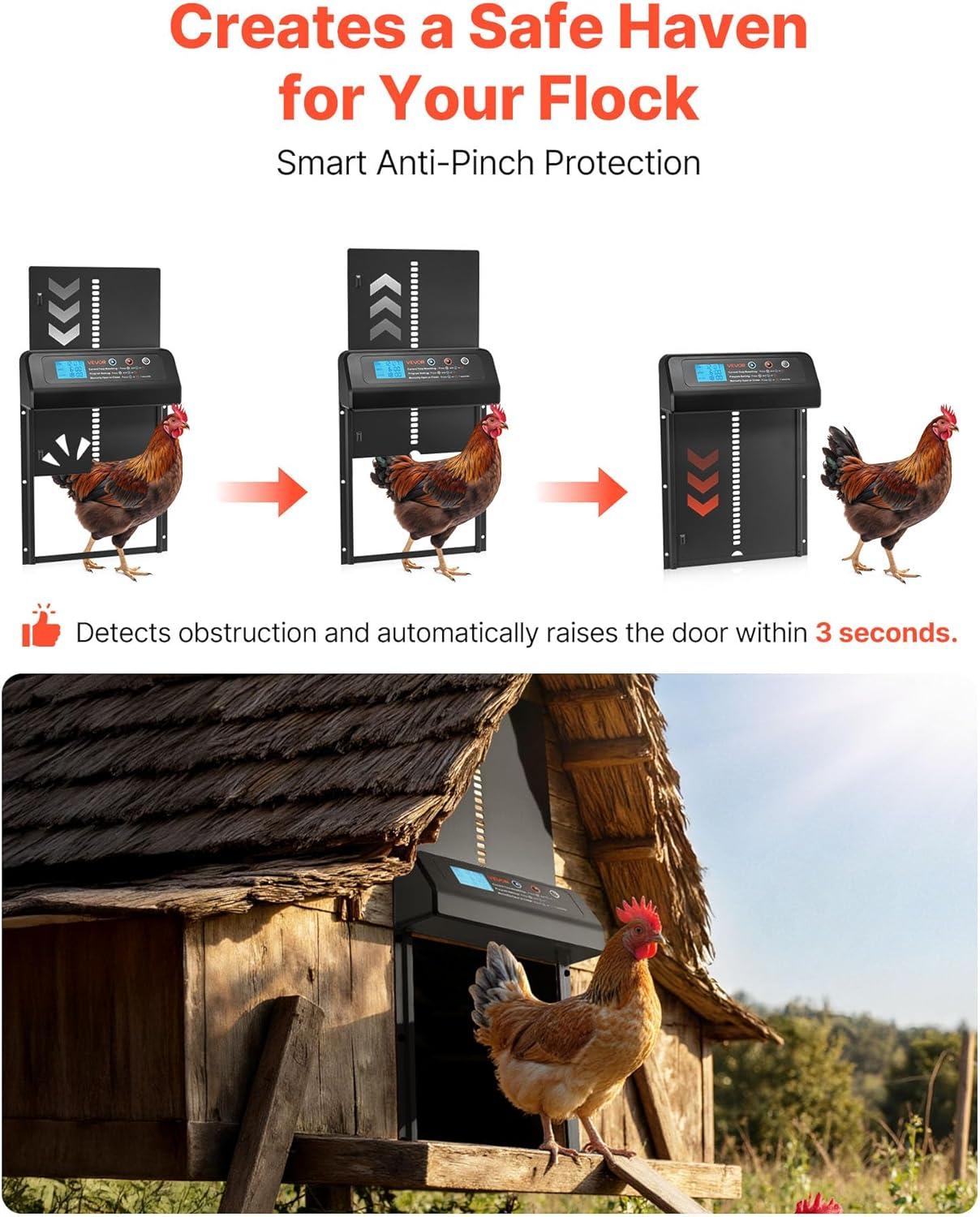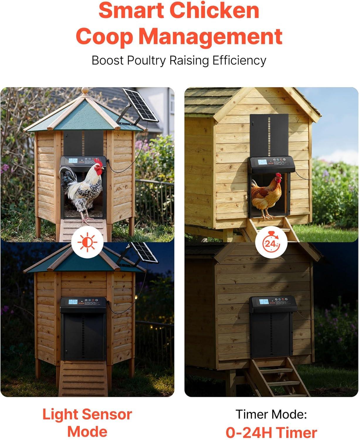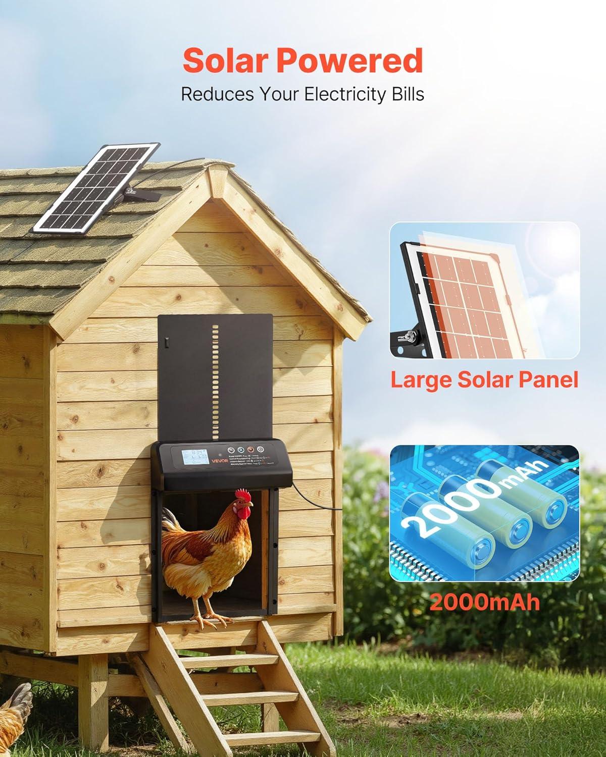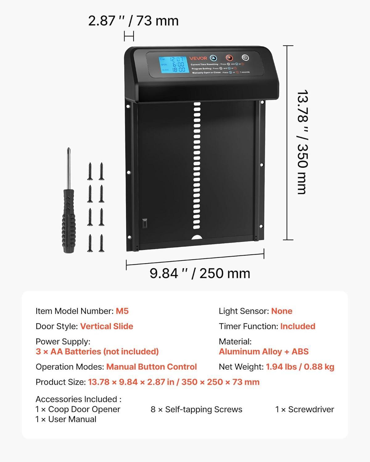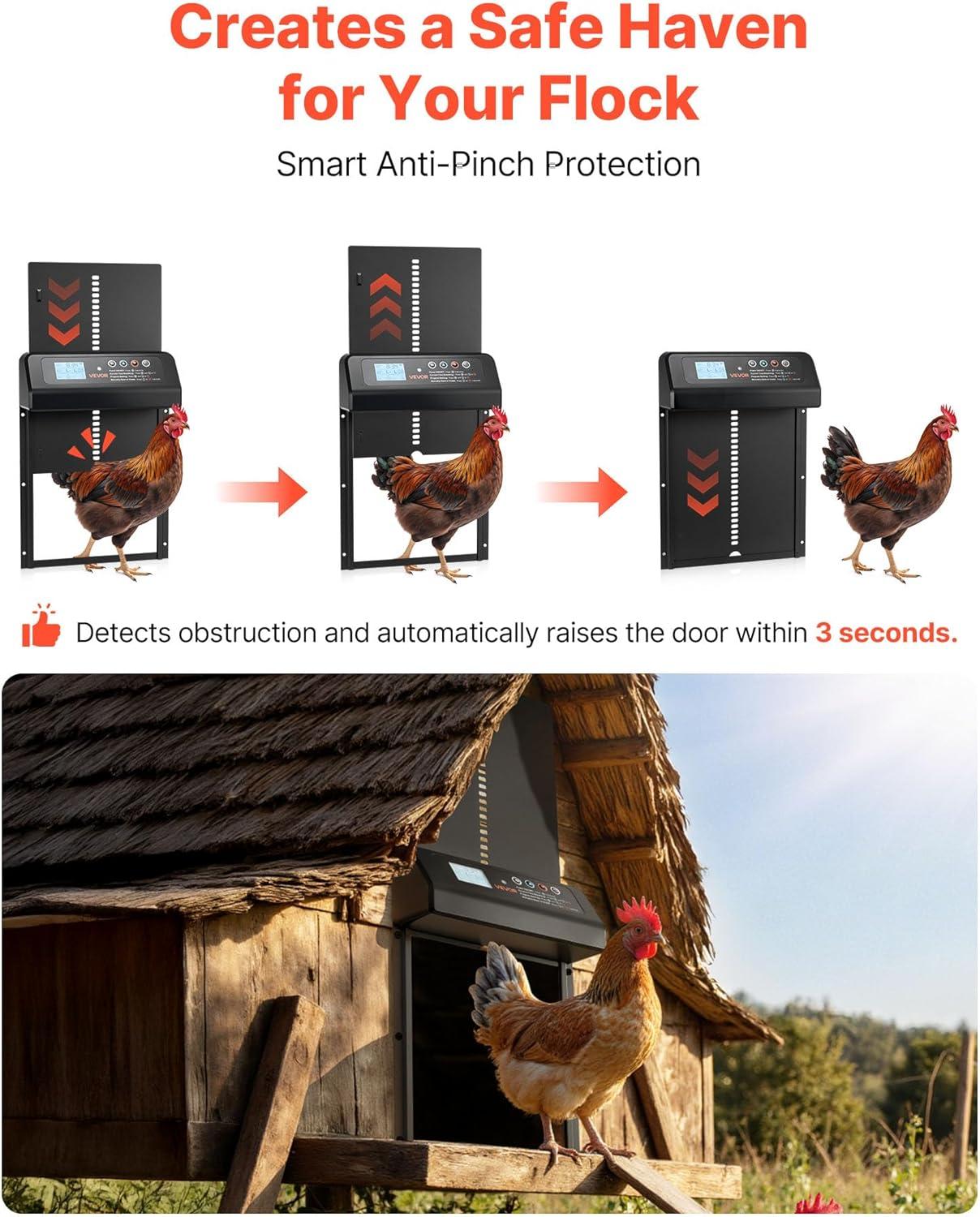 Get more for your money with our exclusive bundle deals on VEVOR Automatic Chicken Coop Door, Auto Chicken Door Opener with Timer & Light Sensor Aluminum Chicken Coops Door with Remote Control and LCD Screen, 4 Modes Opening, Battery or DC Powered(Black) and accessories.
