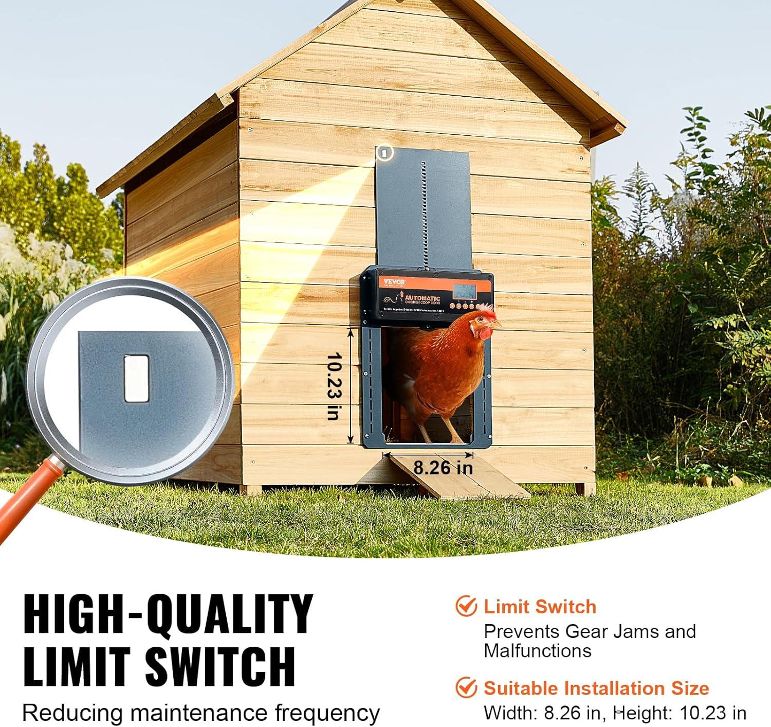 Dual Limiters for Safety: The limiters prevent the chicken coop door from moving beyond its maximum open or closed positions. This helps reduce wear on the door, prolonging the lifespan of the opener and reducing maintenance and repair costs.