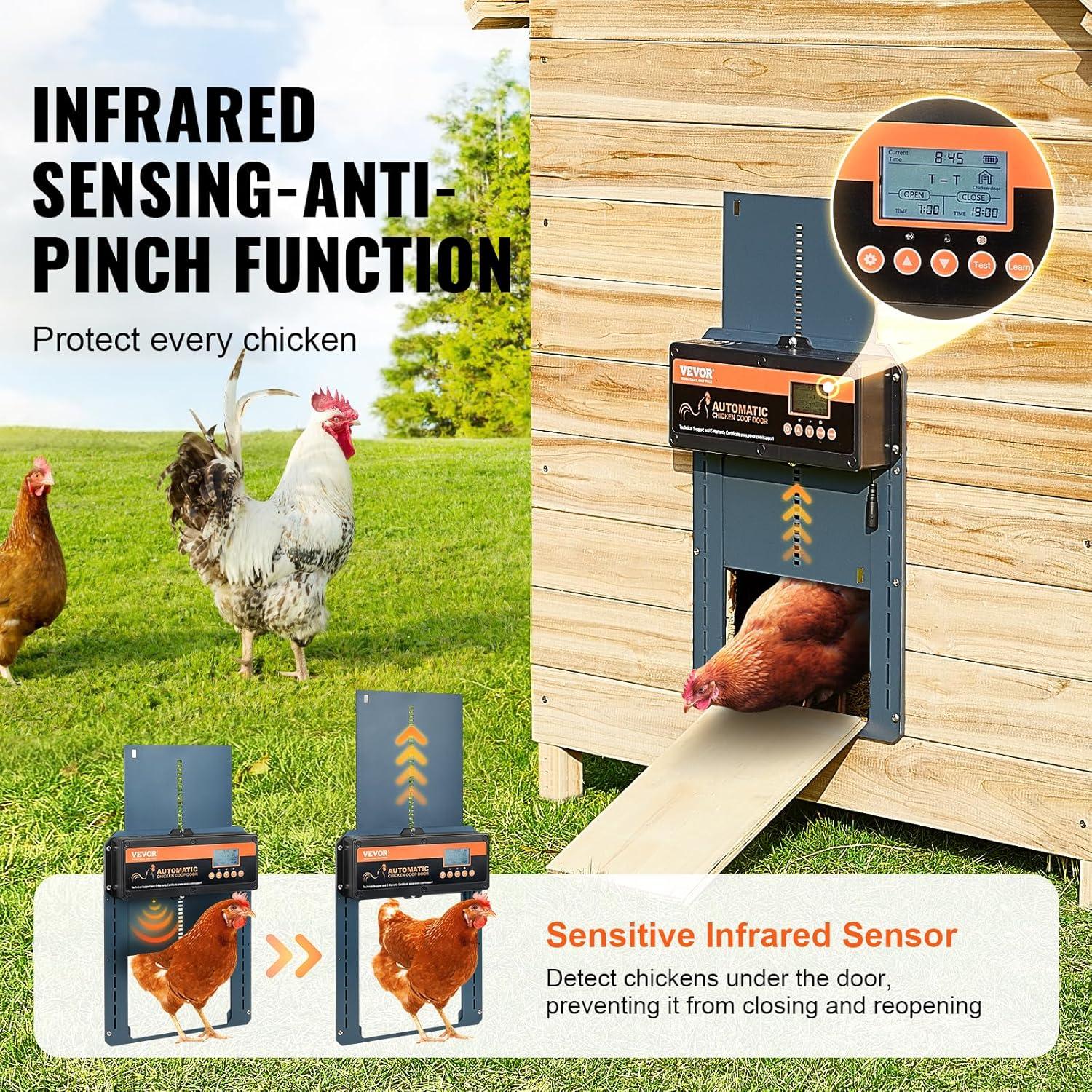 Anti-Pinch Infrared Sensor: Our infrared sensor is designed to protect your chickens from accidents. If it detects any obstacles when closing the door, such as chickens or other objects, the automatic chicken door opener will immediately stop closing. The LCD screen provides real-time status updates, including whether the door is open or closed and the remaining battery life.