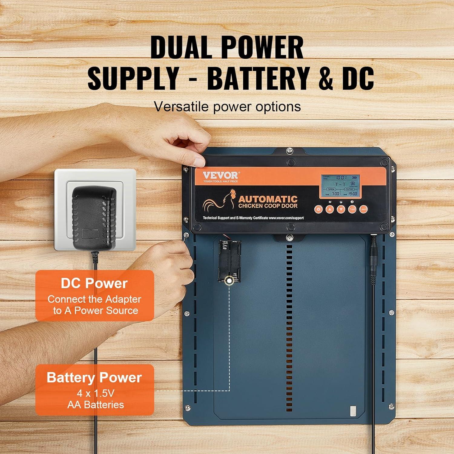 Battery or DC Power: Our automatic chicken door is versatile and easy to install, requiring no complicated wiring. It can be powered by batteries, ensuring convenience in all conditions. We provide 4 AA batteries and a 27A/12V battery for the remote control, so it's ready to use right out of the box with no need to purchase additional batteries.