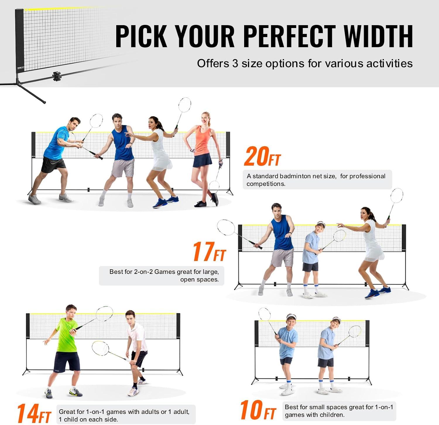 Multi-Sport Net: This foldable sports net comes in four widths (10/14/17/20 ft) with adjustable height (3-5.1 ft), making it ideal as a tennis net, badminton net, or children's volleyball net. Use it in your yard, at the beach, on the driveway, or any flat area. Have fun anywhere, anytime!