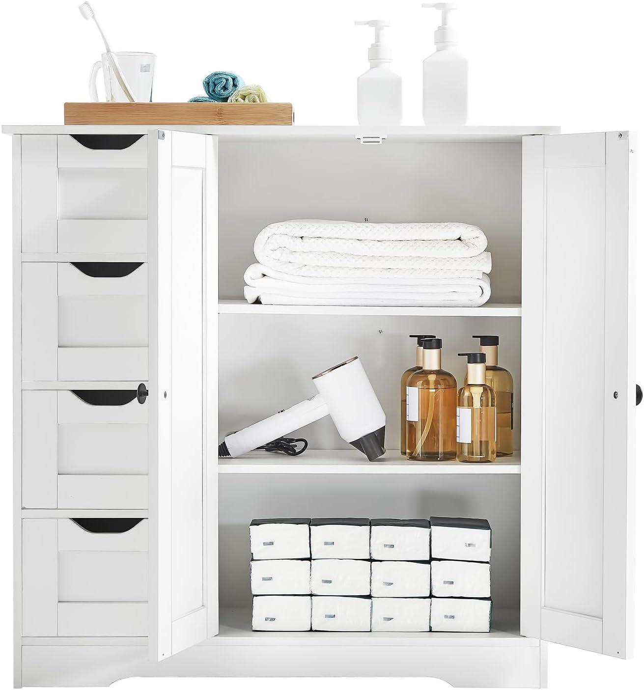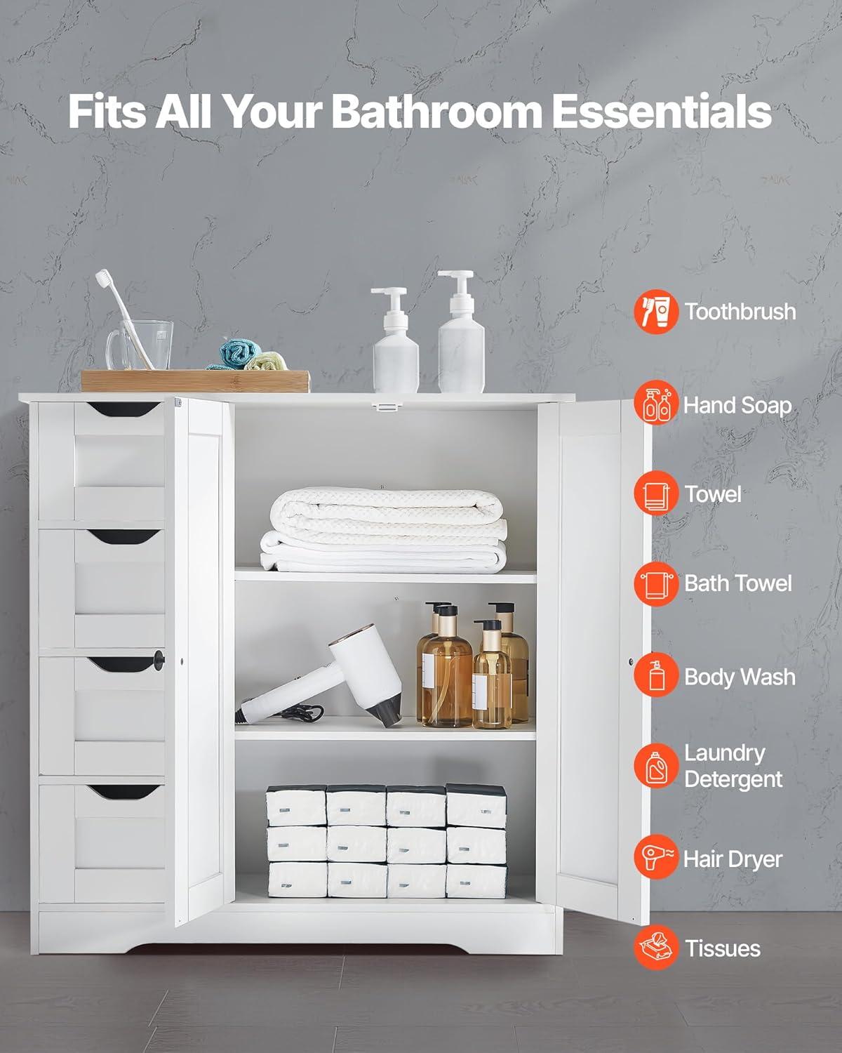 VEVOR Bathroom Floor Cabinet, 4-Tier, Wooden Storage Organizer with 2 Doors, 2 Drawers and Adjustable Shelf, Modern Home Furniture Freestanding Cupboard for Kitchen/Living Room/Entryway Use, White(4 Doors)