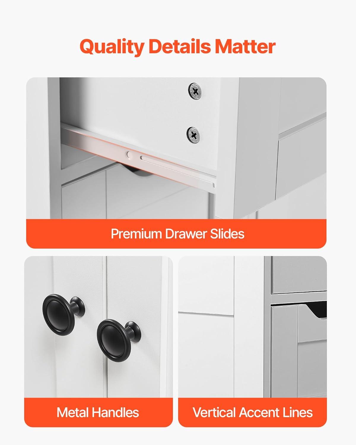 VEVOR Bathroom Floor Cabinet, 4-Tier, Wooden Storage Organizer with 2 Doors, 2 Drawers and Adjustable Shelf, Modern Home Furniture Freestanding Cupboard for Kitchen/Living Room/Entryway Use, White(2 Doors + 4 Drawers)