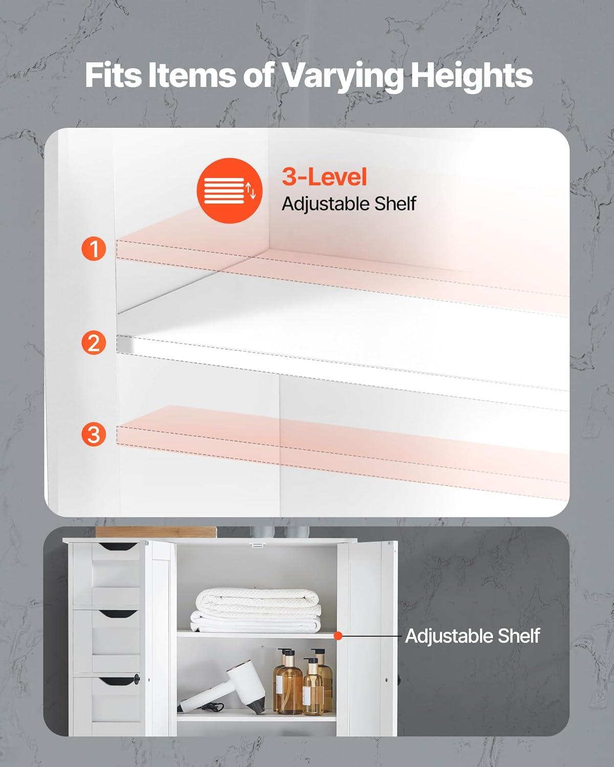 Adjustable Shelf Heights: Equipped with pre-drilled holes, the bathroom floor storage cabinet provides five height levels to customize shelf spacing. It is ideal for storing items of different sizes with ease