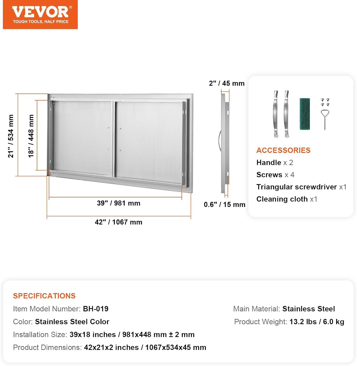 VEVOR BBQ Access Door, 24W x 24H Inch Double Outdoor Kitchen, Stainless Steel Flush Mount Door, Double Wall Vertical with Handles and Hooks, for BBQ Island, Grilling Station, Outside Cabinet(42W x 21H)
