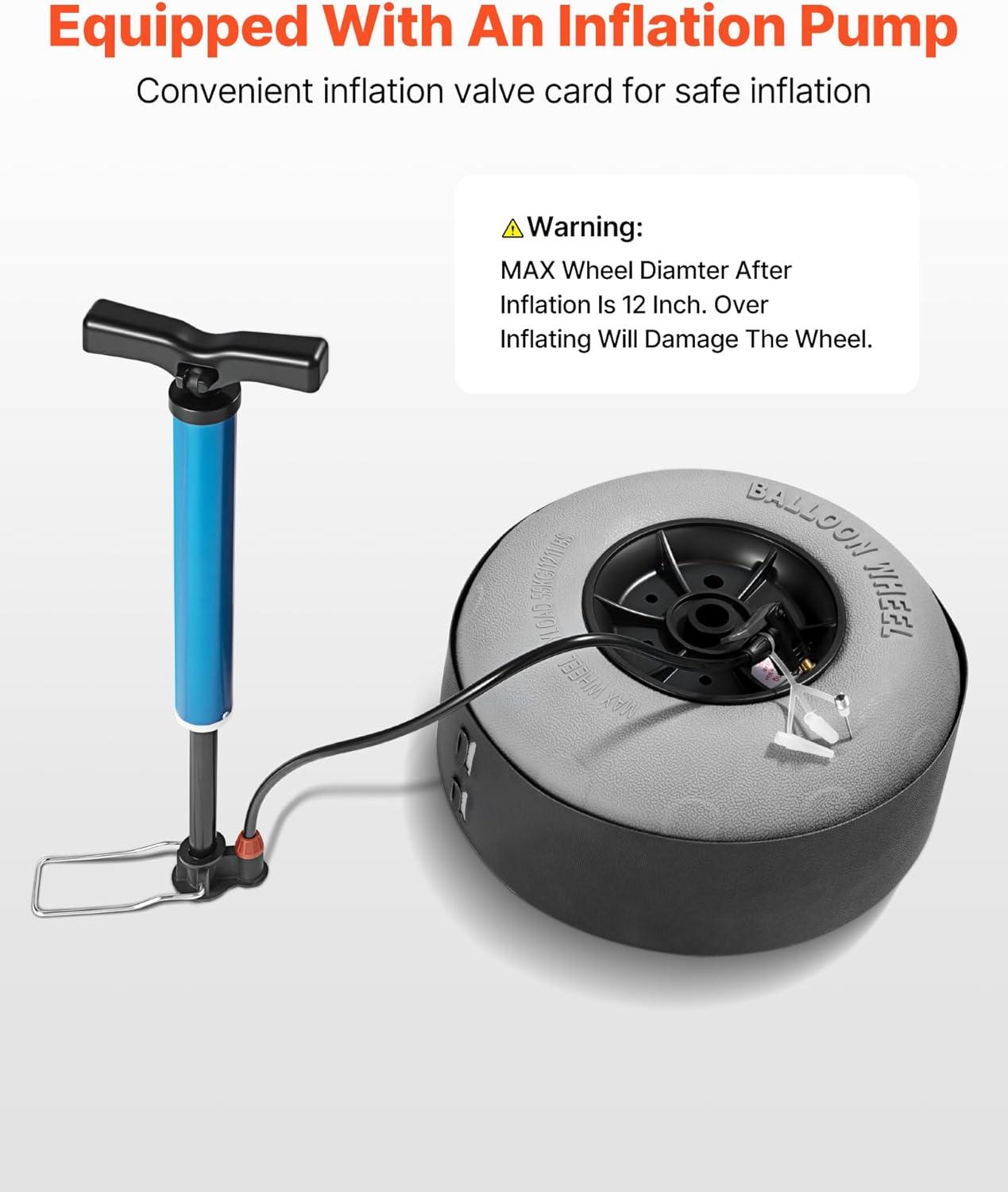Beach-Specific Balloon Wheels: Our 12-inch balloon wheels are designed specifically for beach terrain. They smoothly navigate sand, mud, grass, and rough terrain without sinking. Equipped with an air pump and inflation valve, they are safely inflated for soft, highly elastic, and durable performance.