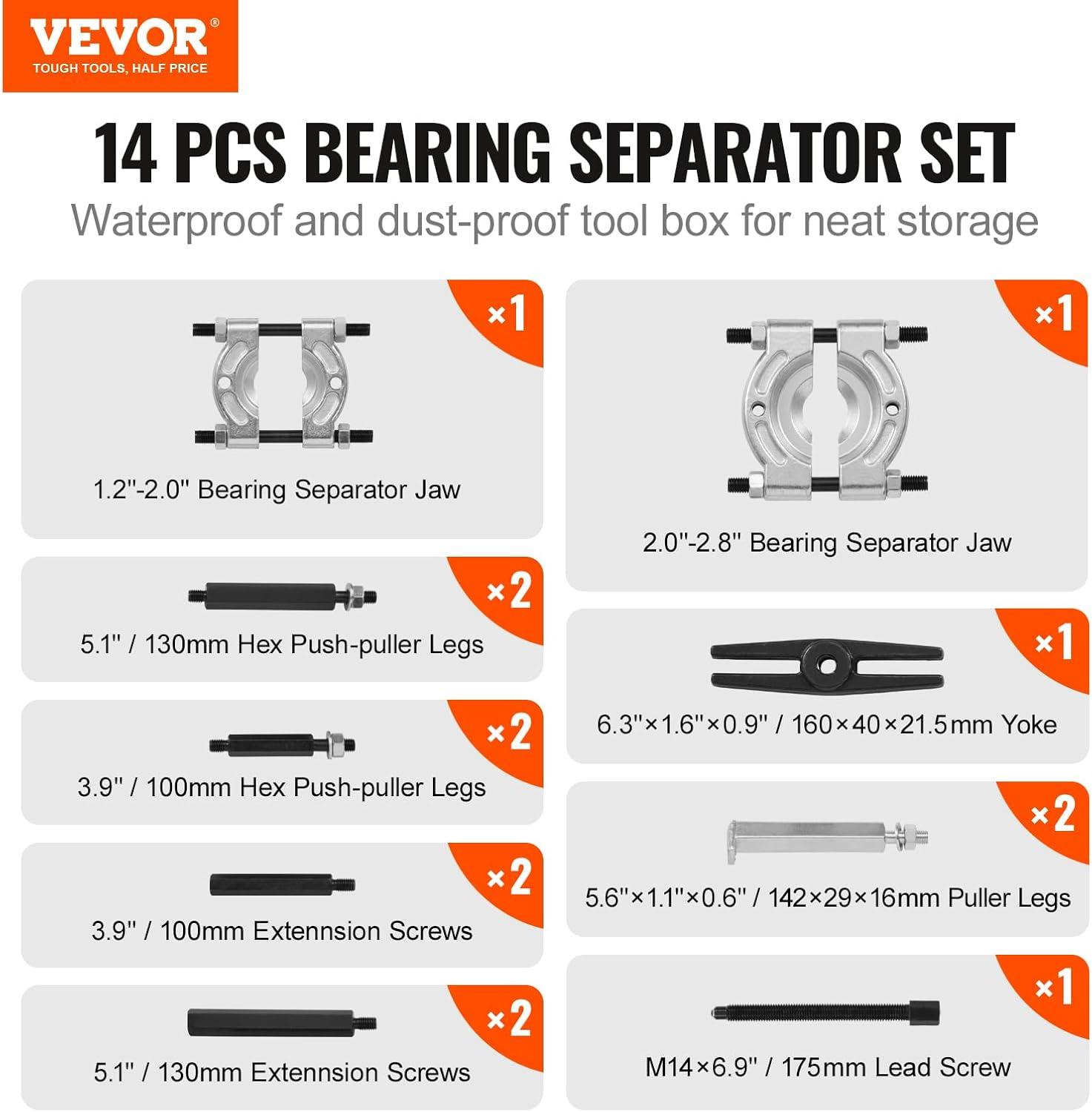 Complete 14-Piece Set: Our bearing separator set includes 2 separators, 4 hex push-puller legs, 4 extension screws, 1 lead screw, 2 puller legs, and 1 yoke. Everything is neatly organized in a dustproof and waterproof storage box, making it easy to carry and store. This comprehensive bearing splitter tool kit ensures you have the right tool for the job every time.