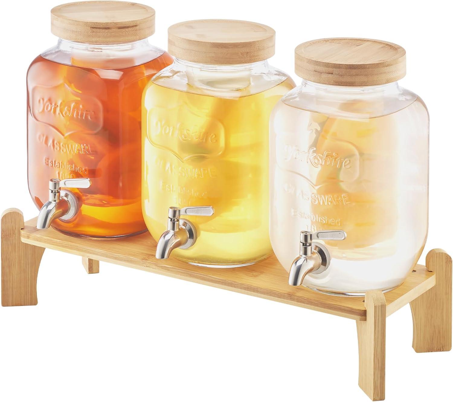 VEVOR Beverage Dispenser, 2 Pack 1 Gallon Drink Dispensers for Parties, Glass Juice Dispenser with Wood Stand, Stainless Steel Spigot, Infuser, Iced Tea Lemonade Juice Water Dispensers for Parties(1Gal 3Pack)