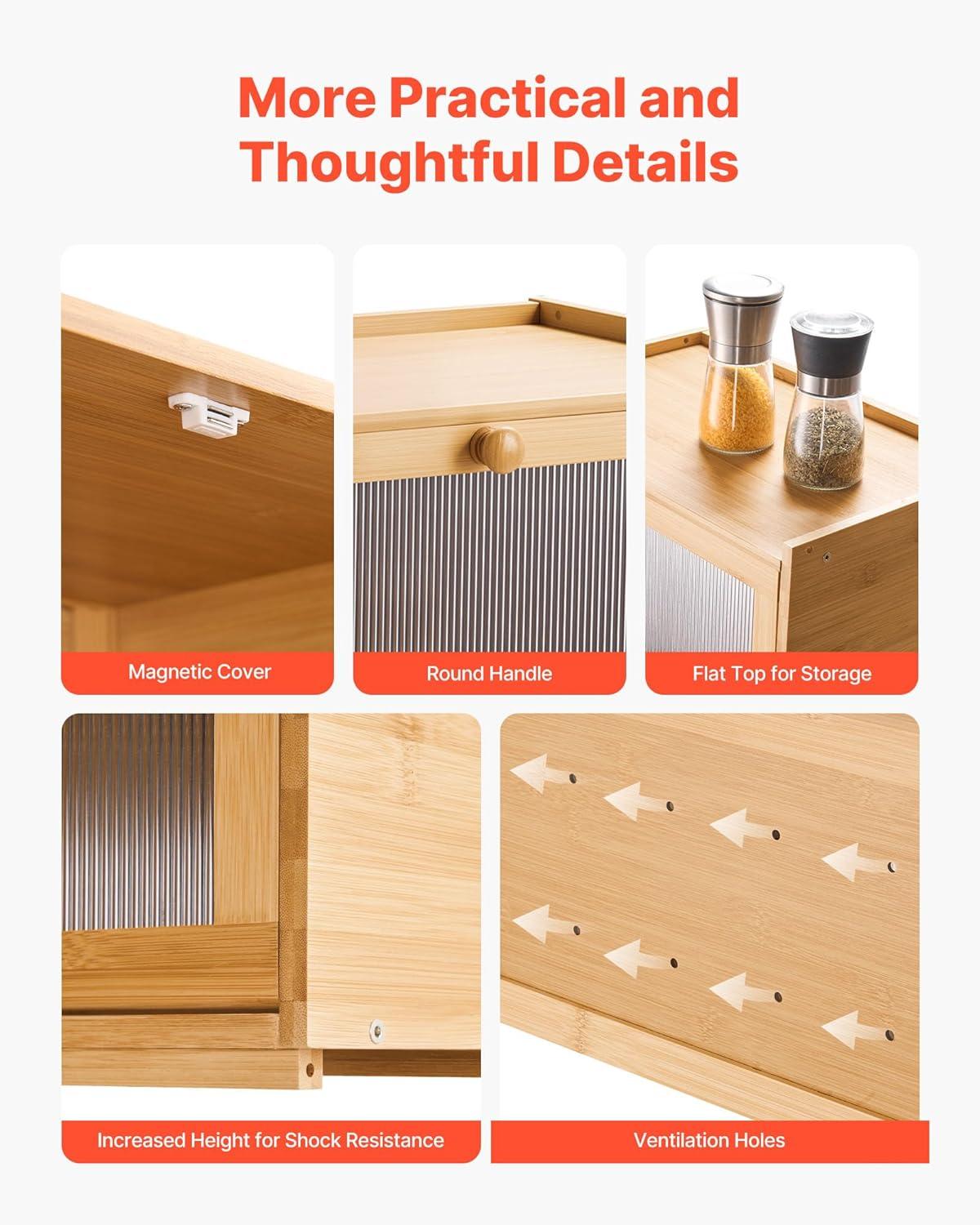 Durable and Ventilated Material: Crafted from natural bamboo, this wooden bread storage bin is both reliable and durable. The back features ventilation holes that promote airflow, extending the freshness of your bread and keeping food fresh