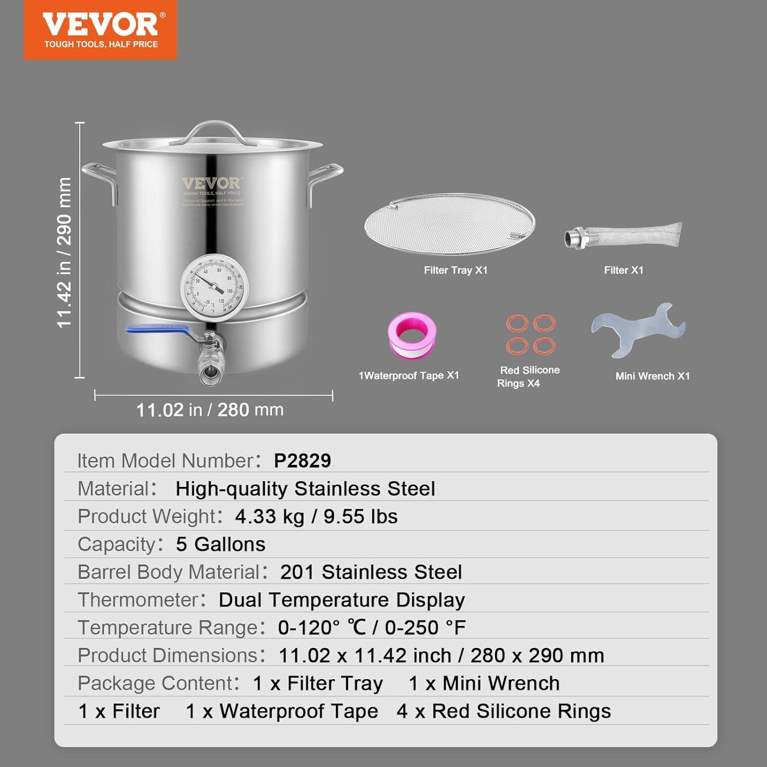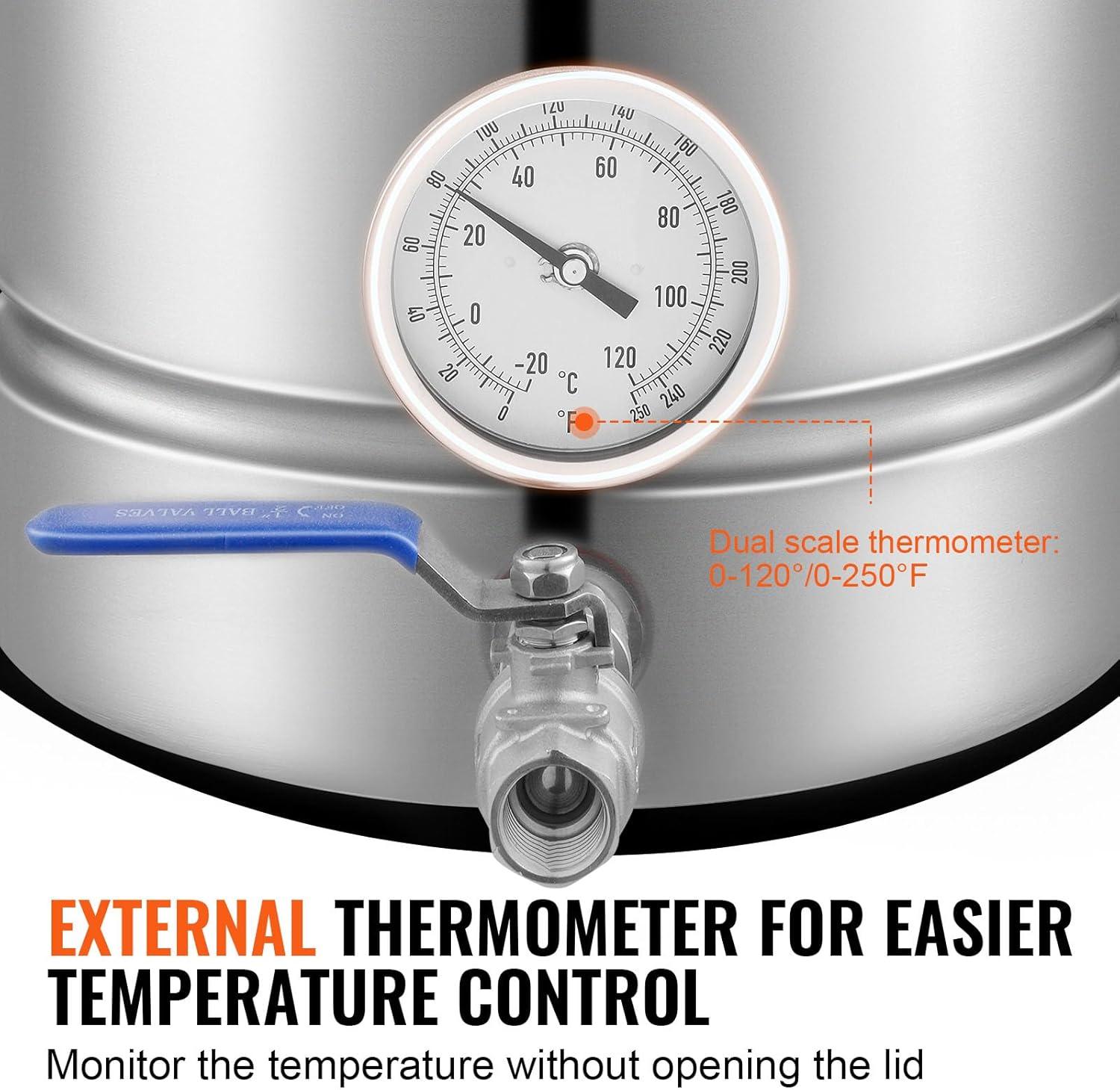 Convenient and Safe Temperature Control: The home brew kettle features an exposed thermometer design, allowing you to monitor the temperature without having to open the lid, ensuring safety and efficiency. The dual-scale thermometer, reading from 0-120°/0-250°F, offers convenient readings and precise temperature control. Accompanied by a high-quality stainless steel lid, it provides a tight seal, aiding in heat retention.