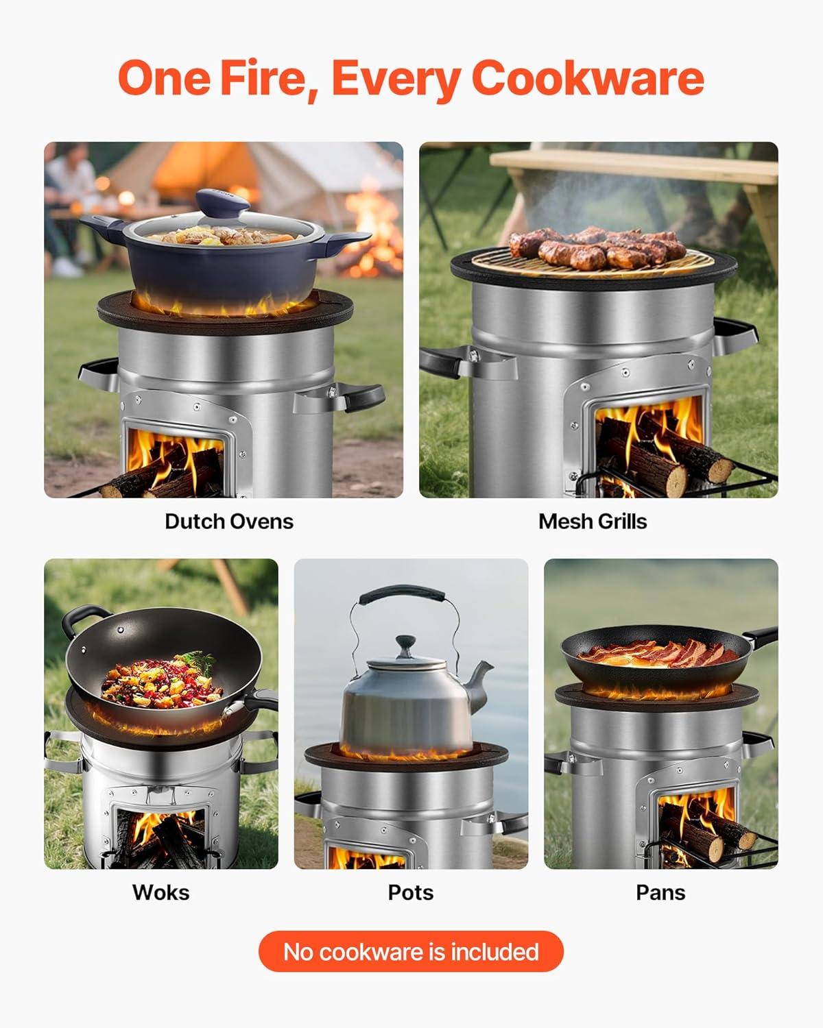 Wood Compatible: This camping rocket stove supports firewood for versatile use in various outdoor conditions. Choose what's available—wood, branches or twigs