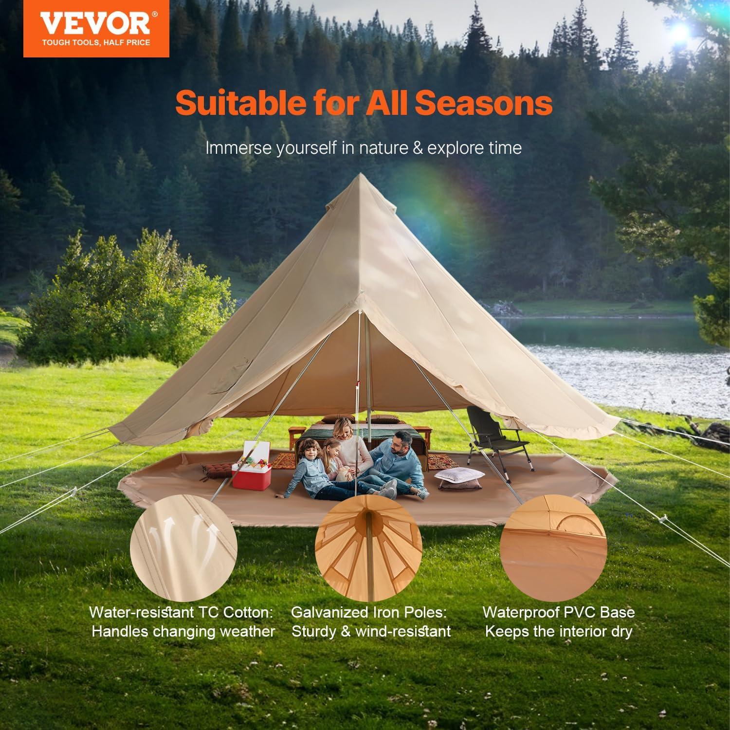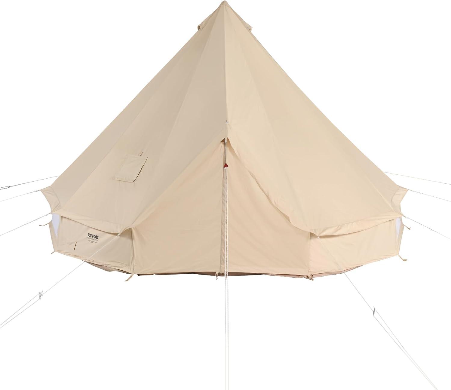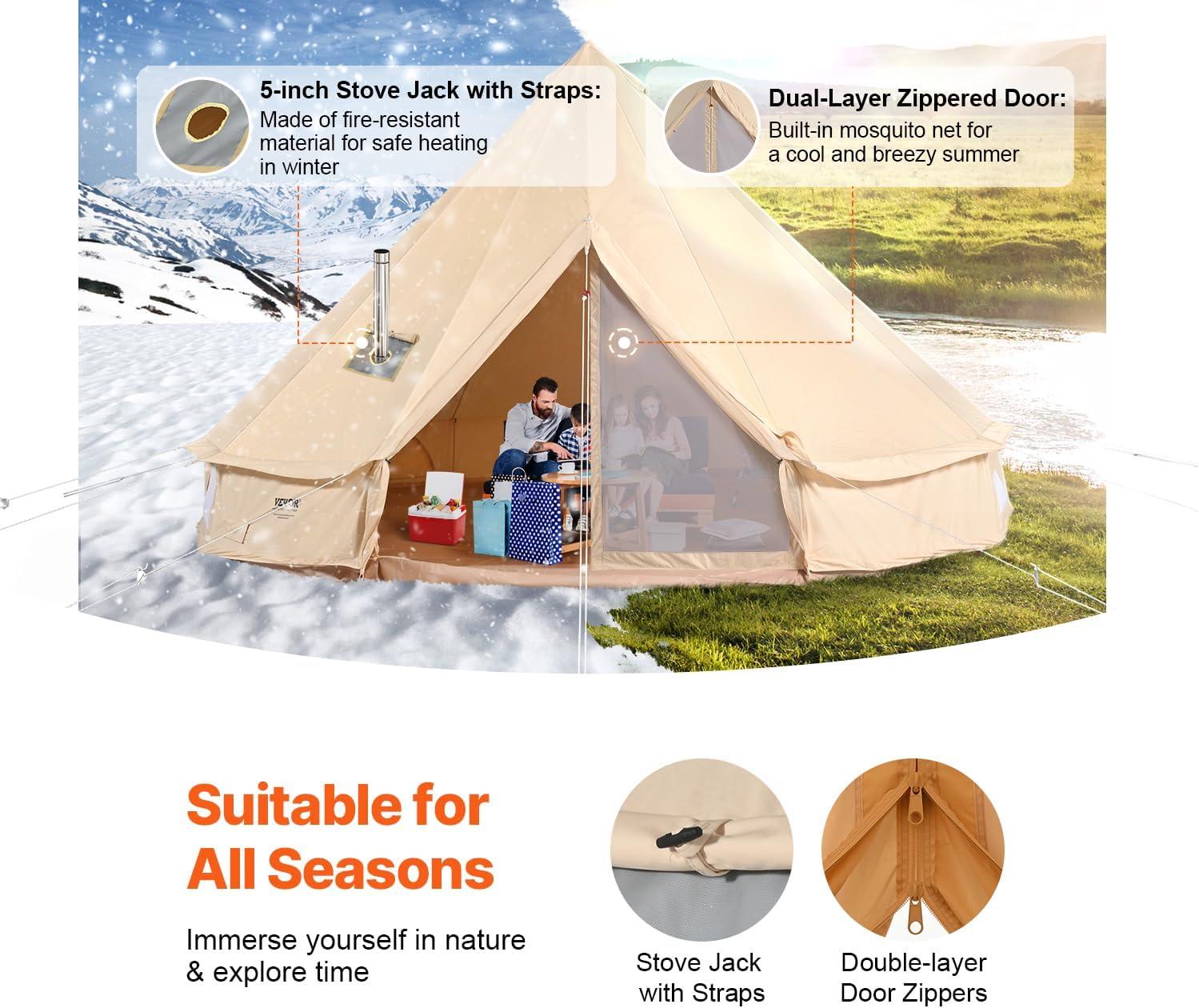 Comfortable Experience: The 5″ stove hole, made from flame-resistant material, features a 43x43cm flap, allowing safe indoor heating. Four mesh-covered windows offer excellent ventilation and protection during the summer. Roll-up canvas and mesh keep critters out while letting cool breezes in for a peaceful sleep.