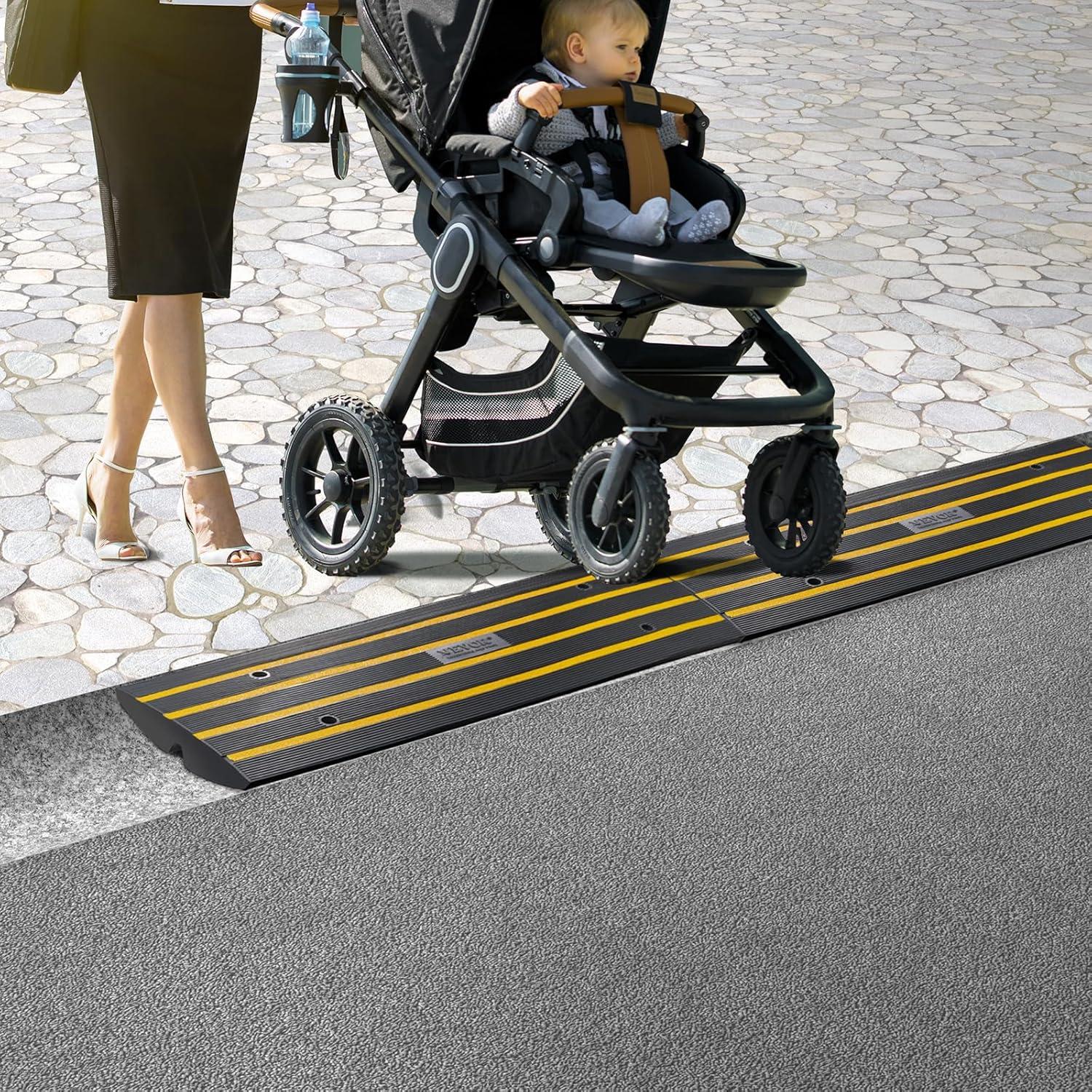 Max. 33069lbs Capacity Rubber: The driveway curb bridge is constructed with rubber, recycled, wear-proof, and weather-proof for long-lasting usage under various outdoor conditions. Such industrial-level rubber construction can support up to 33069 lbs loading. Suitable for standard vehicles like SUVs, vans, mobile wheelchairs, motorcycles, bikes, scooters, and hand trucks to pass through securely up or down uneven ground or curbside.