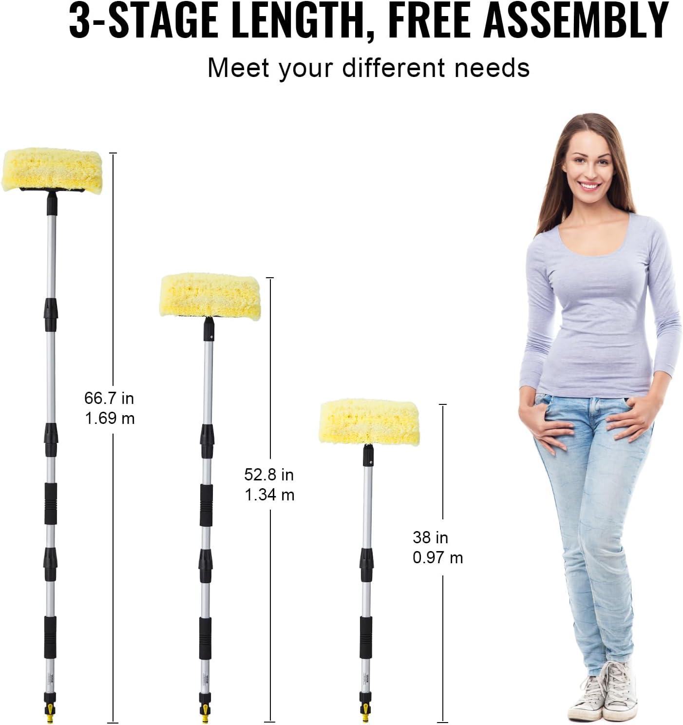 Reach Higher, Wash Faster: Our car wash brush with long handle reaches up to 66.7-inch, allowing you to easily access high areas like car roofs without a ladder. Safely and conveniently clean cars, trucks, RVs, house siding, SUVs, boats, decks, bathrooms, and more with ease.