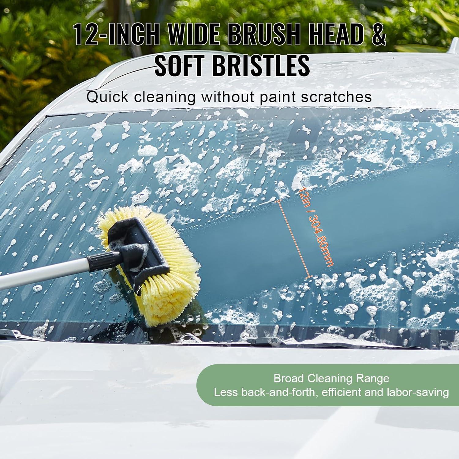Soft Bristle Brush Head: 12-inch wide brush head features soft, high-density PVC bristles that effectively remove stains without scratching car paint. Its 5-sided bristle design fits perfectly into corners, adapting to curves and uneven surfaces to effortlessly scrub away hard-to-reach dirt and stains.