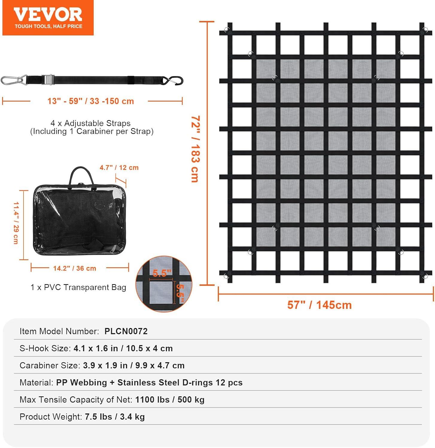 Tight Mesh Protection: VEVOR truck cargo net adopts wide and flat mesh structure design to avoid tangling and knotting, which can overlay a variety of large cargos. Small holes of mesh can avoid falling small items, providing more comprehensive protection.
