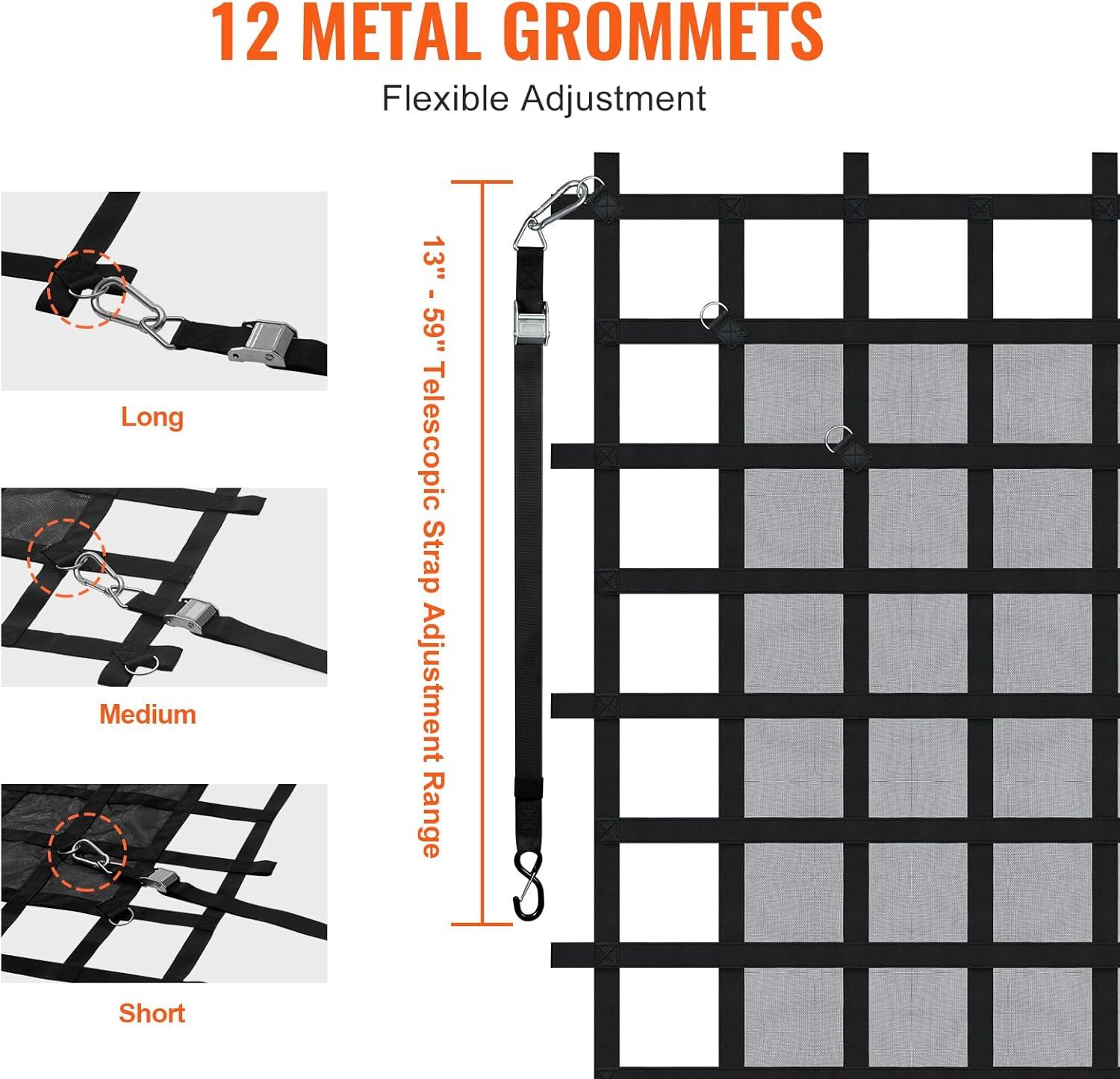 Multi Fixing Points, Flexible Adjustment: The cargo net with 13″ – 59″ adjustable telescopic straps and 12 stainless steel D-rings allows you to adjust the fixing point on demand. Then you can ensure that the cargo net can fit a variety of sizes and shapes, which is ideal for heavy or irregular cargos use.