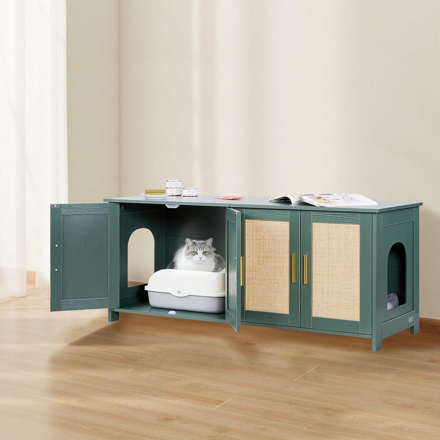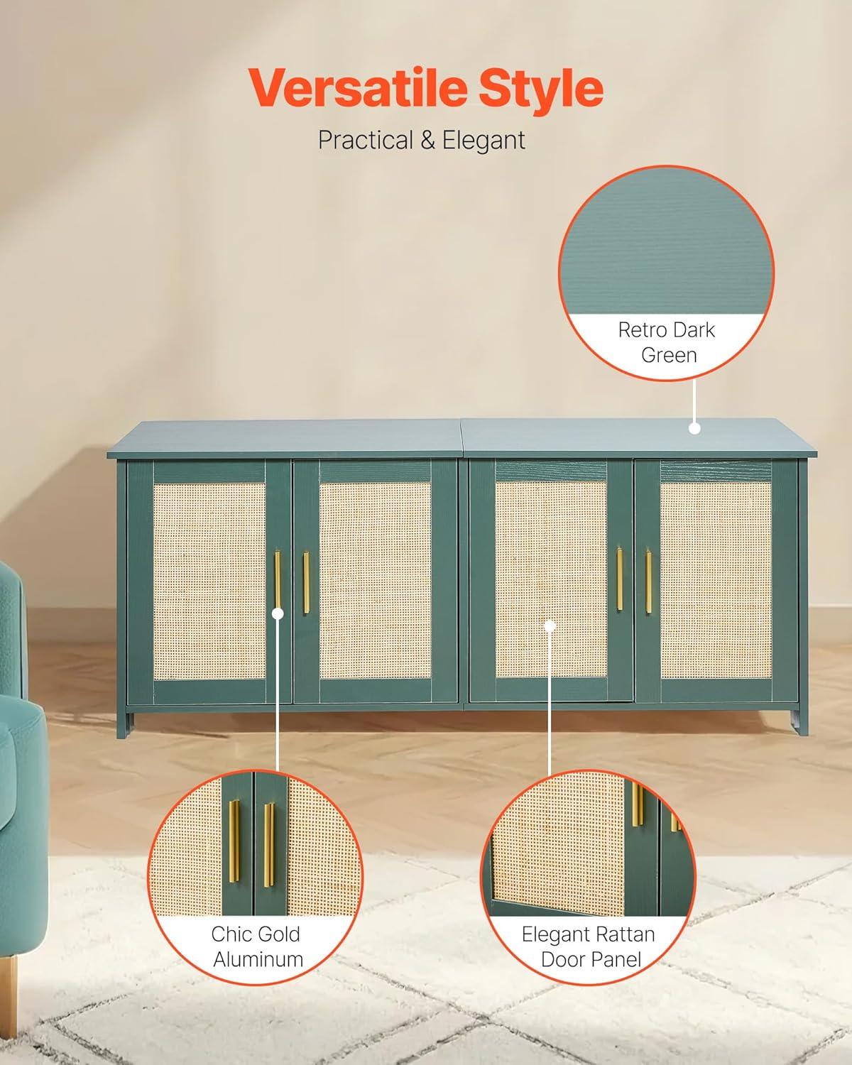 VEVOR Cat Litter Box Enclosure for Multi Cats, 47.2 in Hidden Litter Box Cabinet with 4 Doors & 2 Entries, Indoor Cat Washroom, Wooden Kitty House Furniture Side Table, Fit Most Litterboxes, Green(Retro Green & Rattan Doors)